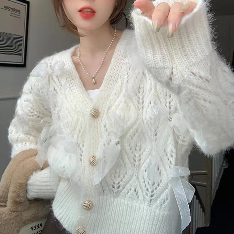 Сладкий и нежный ветер мягкий восковой свитер женский ранняя осень полый бант вязаный кардиган куртка с длинным рукавом топ