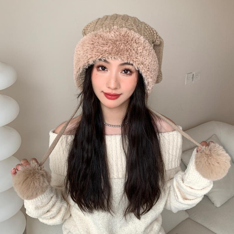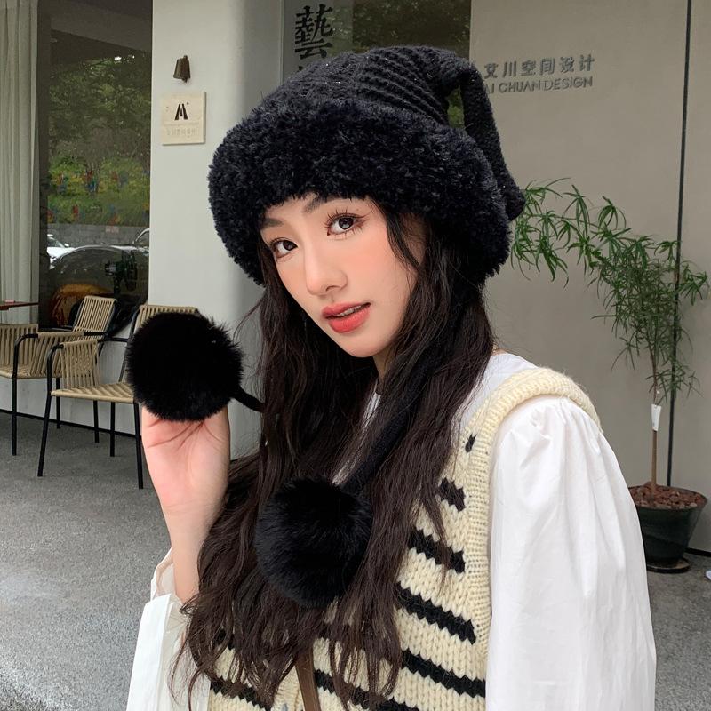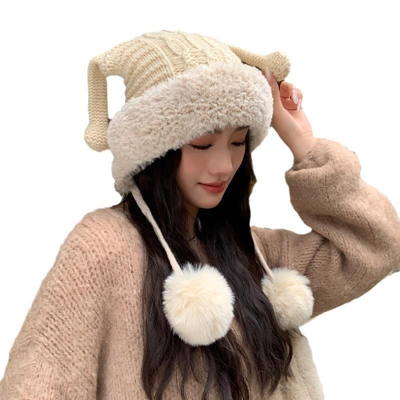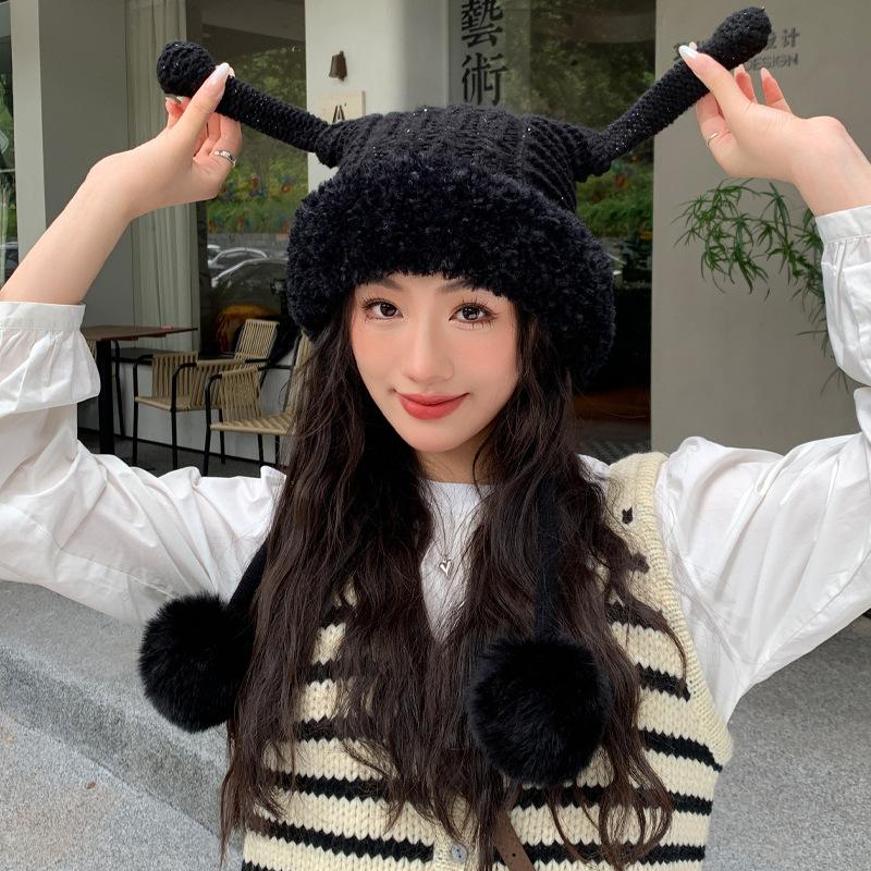 Новые осенне-зимние шапки для женщин, милые забавные шапки с ушками из вязаной шерсти для зимнего тепла и защиты от холода, шапка с помпоном для защиты ушей, толстая