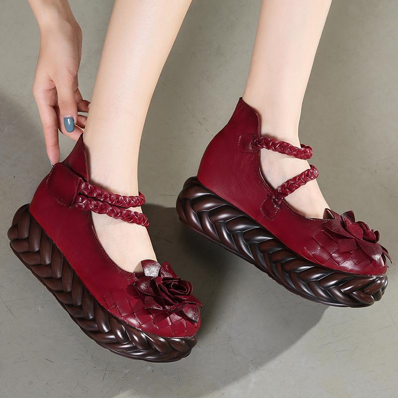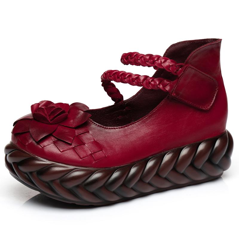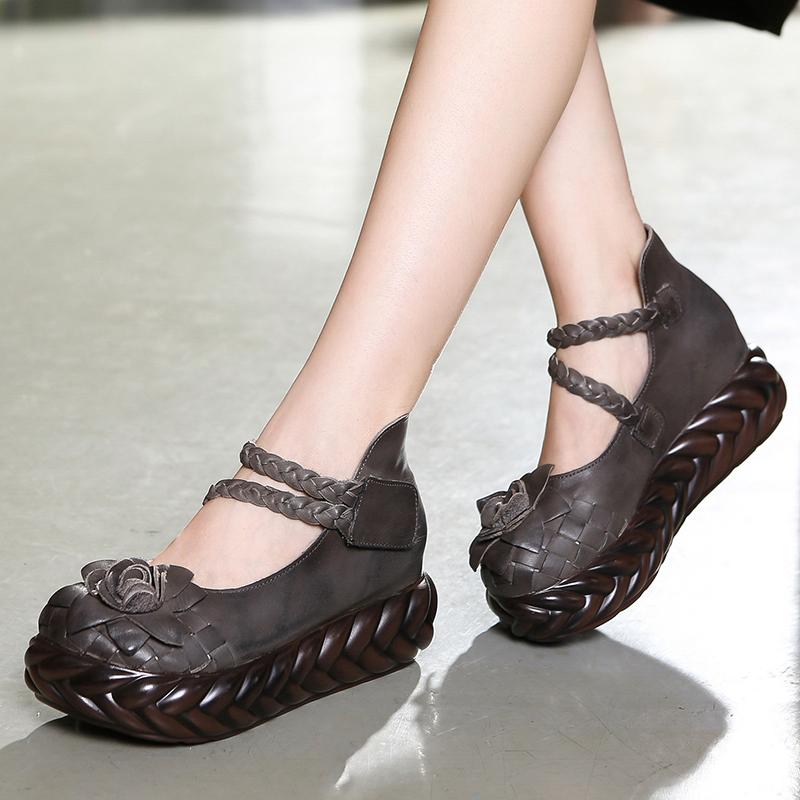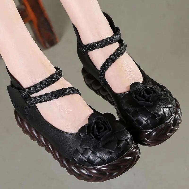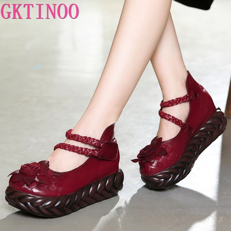 Мода GKTINOO Женские Кожаные Туфли на Высоком Каблуке Клиновидные Туфли Цветок 2025 Осень Лодочки Женские Натуральная Кожа Ручная Работа Туфли Мэри Джейн Платформа