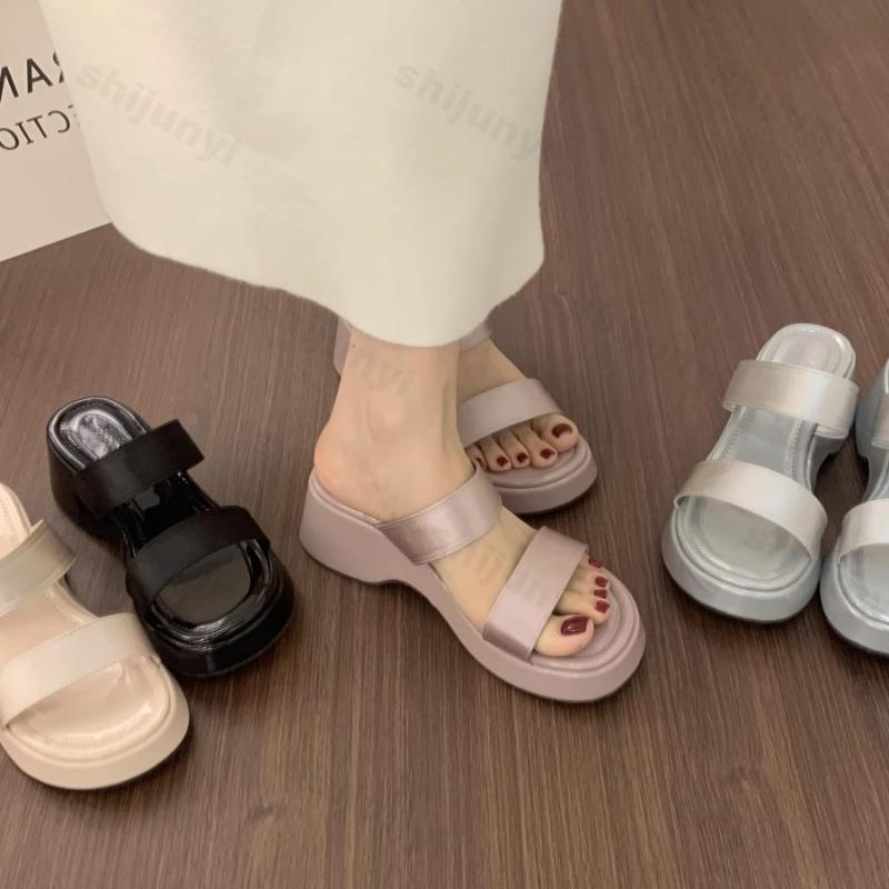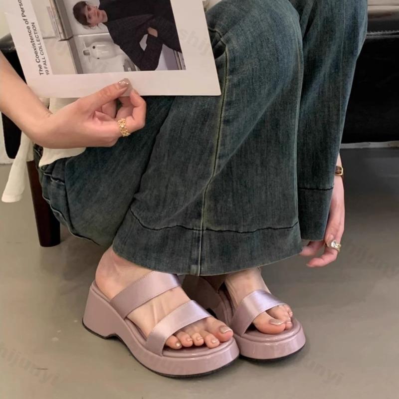 Модные шлепанцы на толстой подошве и наклонном каблуке для женщин, новинка лета 2025 года, уличные пляжные удобные сандалии в французском стиле с открытым носком