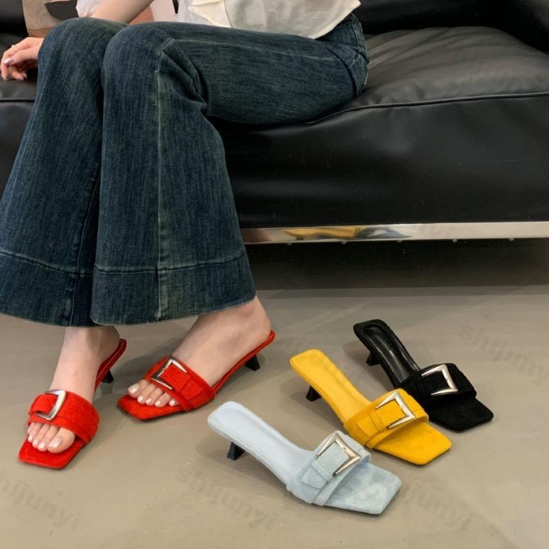 Модные шлепанцы с пряжкой, с открытым носком и квадратным носком, элегантные, удобные, на высоком каблуке, для женщин, лето 2025