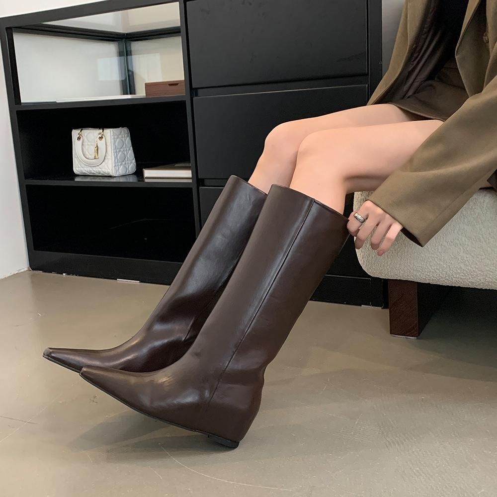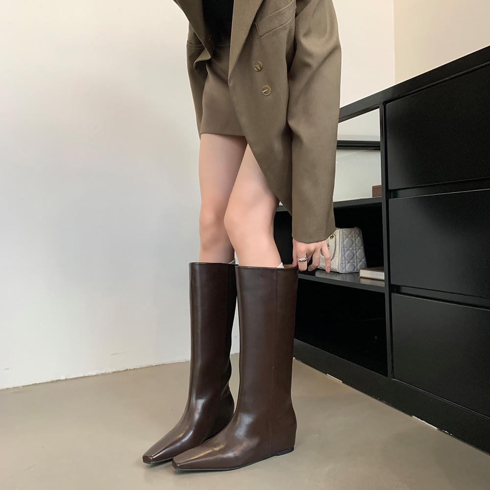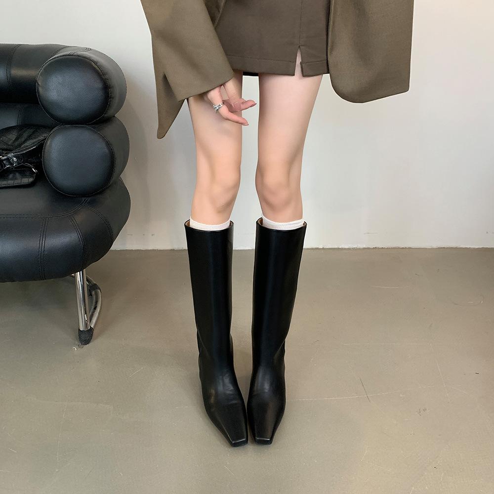 Модные ботфорты до колена в британском стиле с узким квадратным носком, женские черные туфли из мягкой кожи, однотонные, слипоны, на скрытой платформе, длинные ботинки-ботфорты
