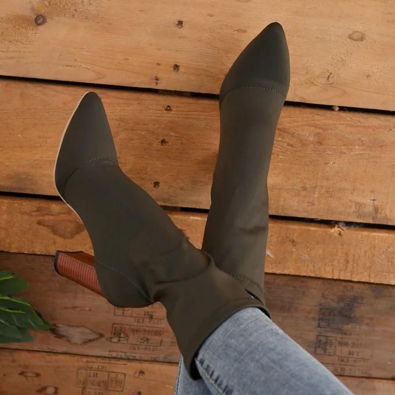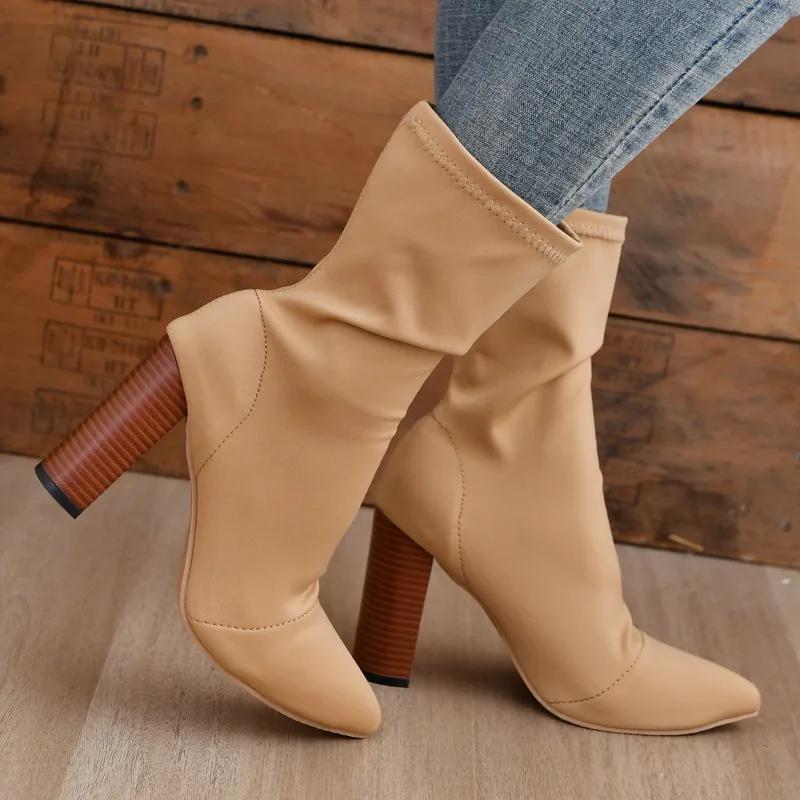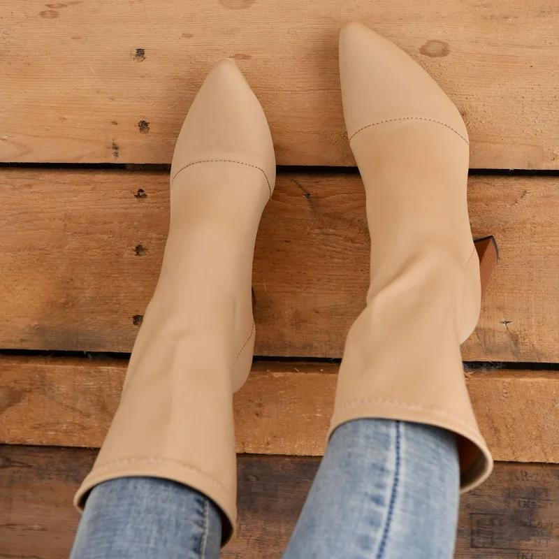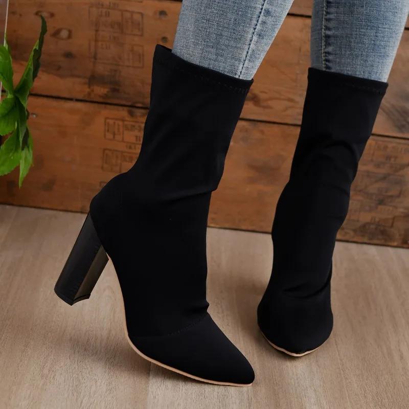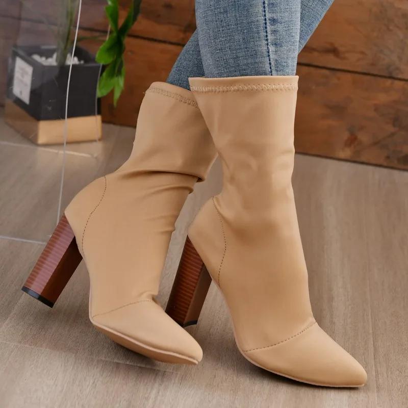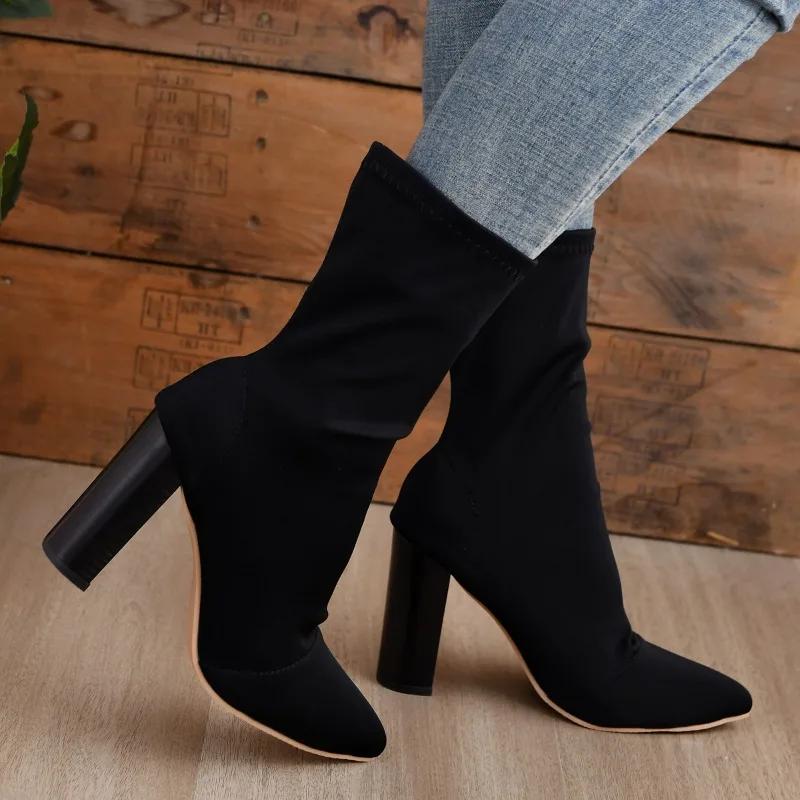 Модные сексуальные женские короткие сапоги с острым носком на толстом высоком каблуке, новые темпераментные сапоги из флока длиной до середины икры, современные туфли
