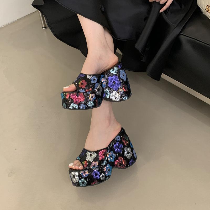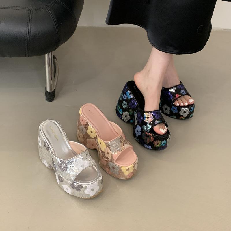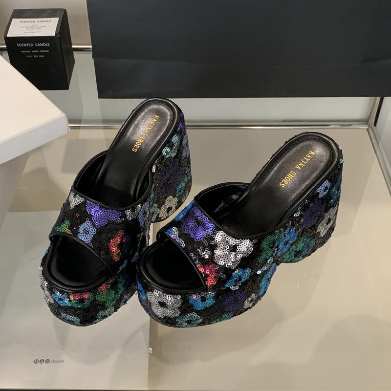 Мода Лето Новые Клинья Обувь Губка Торт Блестящая Платформа Женские Шлепанцы Ретро Слипоны 13 СМ Высокий Каблук Сандалии