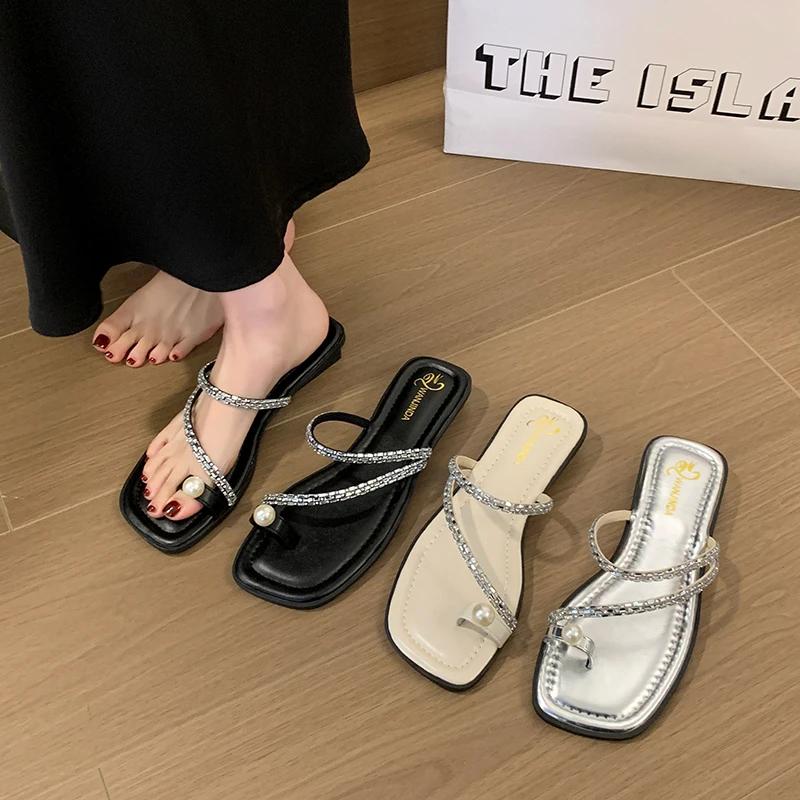 Мода Новая Мода Жемчужная Пряжка Шлепанцы Женщины Плоский Каблук Хрустальная Лента Тапочки Сексуальные Дамские Шлепанцы с Перемычкой между Пальцами Обувь Стразы Сандалии