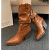 Модные высокие каблуки до середины икры, плиссированные сапоги для женщин, осенне-зимние, коричневые, из искусственной кожи, ковбойские сапоги в западном стиле, женские, на толстом каблуке, ковбойские боты для женщин