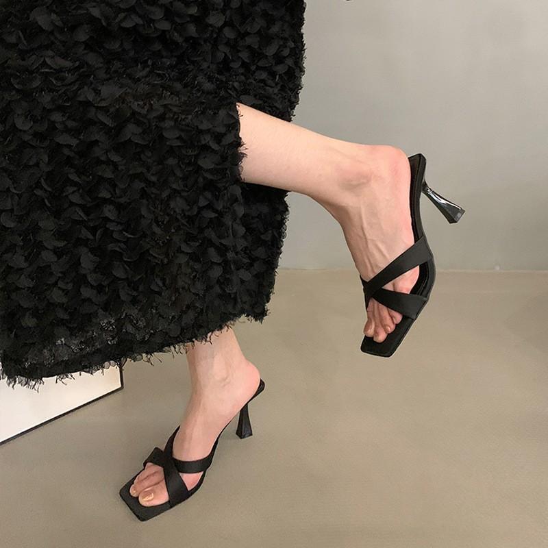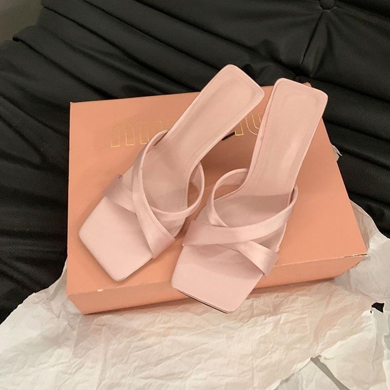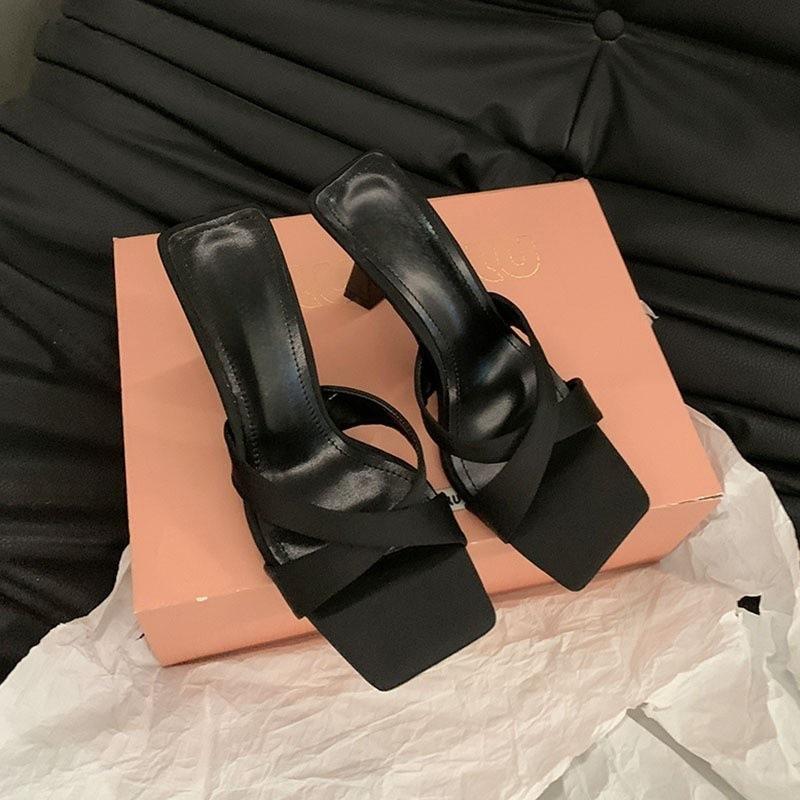 Fashion 2025 Summer New Fairy Style High Heels Women's Silk Square Head Thin Heels Cross Style High Heels One Line Cool Slippers