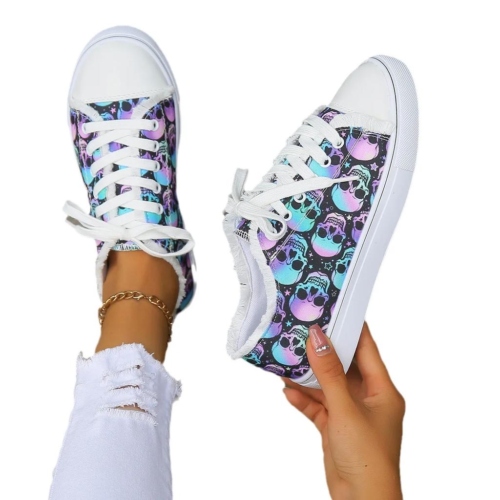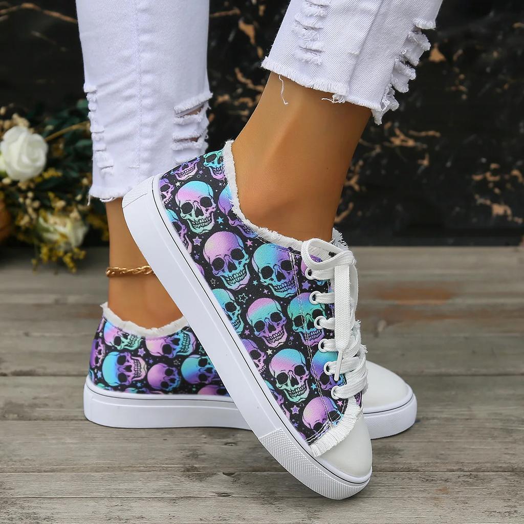 Модная женская парусиновая обувь Модные 3D кроссовки кэжуал с градиентным принтом черепа Дышащая удобная плоская вулканизированная обувь на шнуровке для женщин