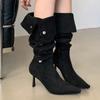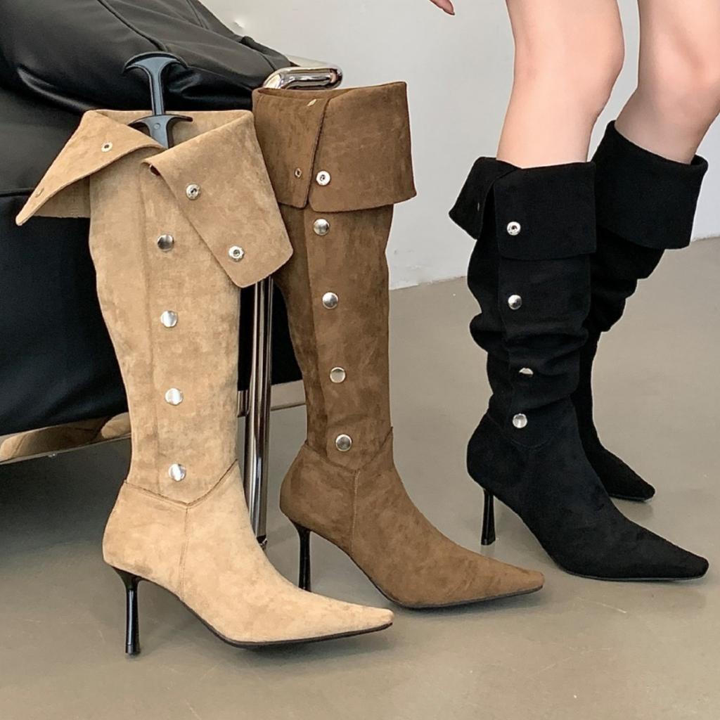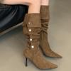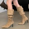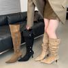 Мода 2025 Новые Ретро Женские Сапоги Матовая Замша Средние Ковбойские Сапоги Высокий Голенище Грубый Каблук Рыцарские Сапоги