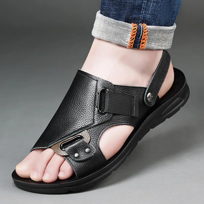 Модная мужская двухцелевая кожаная мужская летняя модная пляжная обувь с мягкой подошвой и цельнолитыми сандалиями для ношения на улице