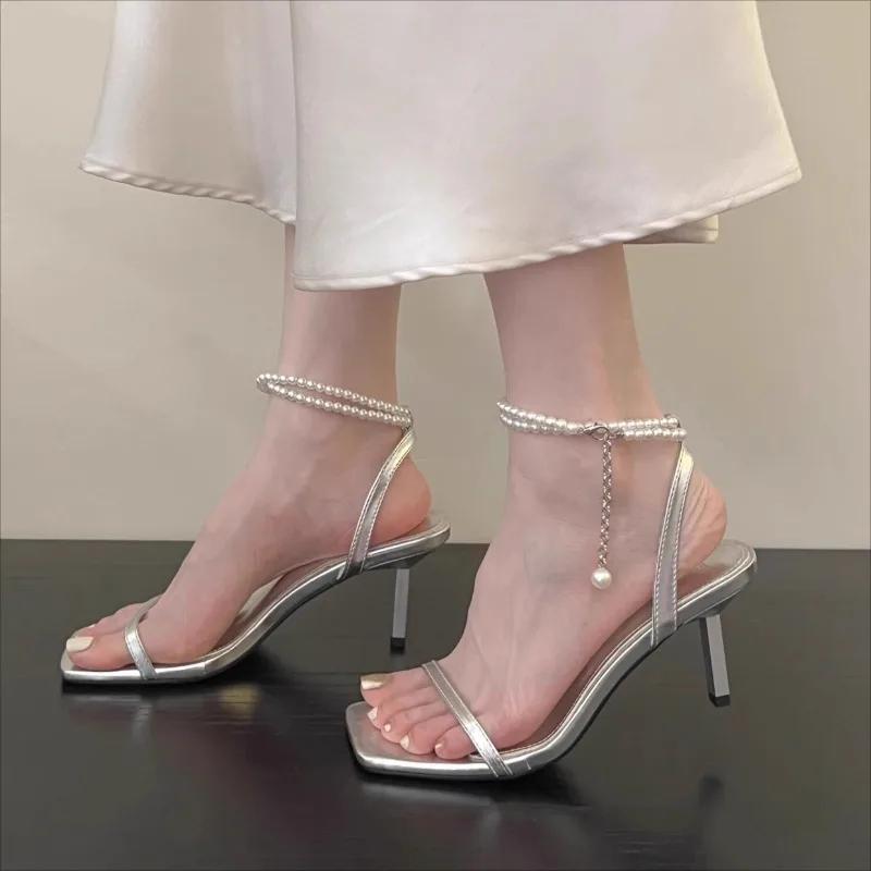 Мода 2024Женские Летние Новая Мода Квадратный Носок Открытый Носок Узкий Ремешок Женские Сандалии Повседневные Жемчужная Цепочка Дизайн Бренда Женские Высокие Каблуки