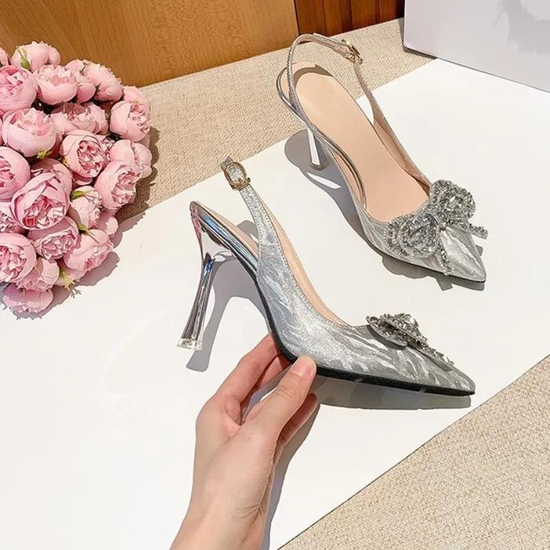 Модные летние хрустальные босоножки на высоком каблуке с закрытым носком, женские летние новые туфли-лодочки с острым носком, на шпильке, с бабочкой, свадебные