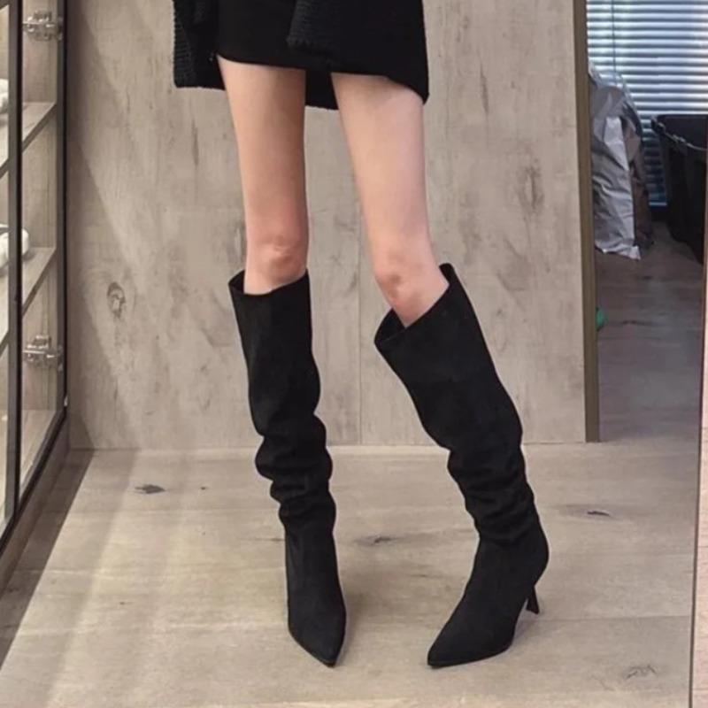 Модные ботфорты до бедра не до колена женские с острым носком из замши слипоны противоскользящие износостойкие на шпильке высокие сапоги