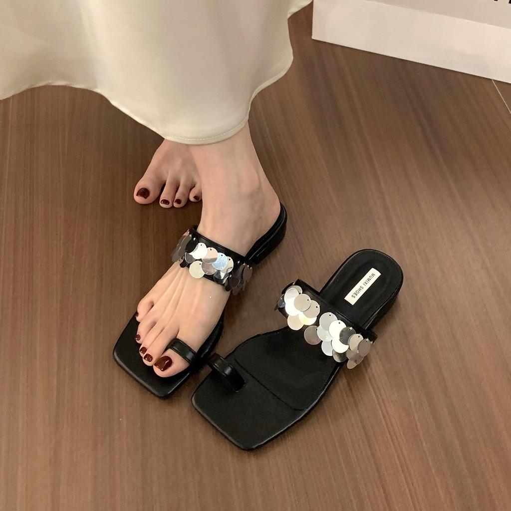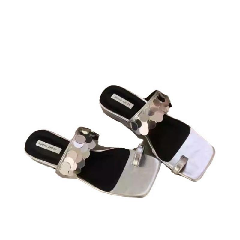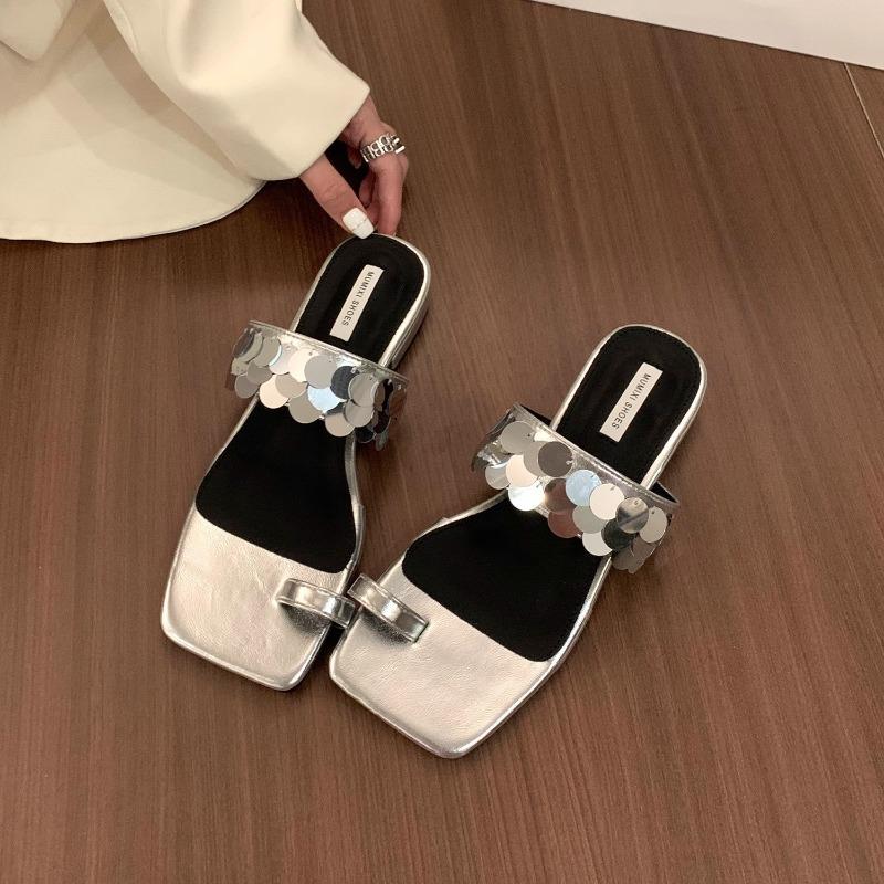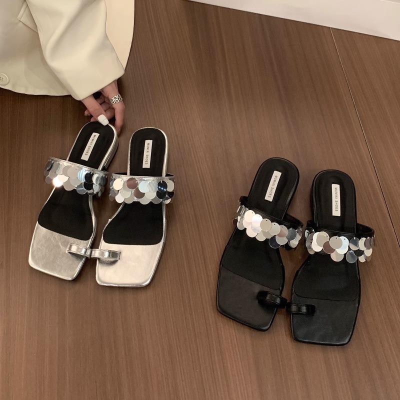 Модные французские женские тапочки со стразами и блестками на толстом каблуке в Корейском стиле 2024 года, модные универсальные серебристые босоножки на низком каблуке, женские шлепанцы