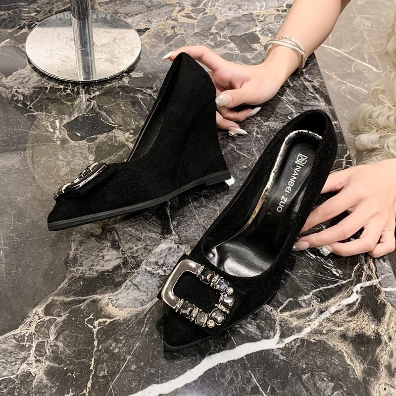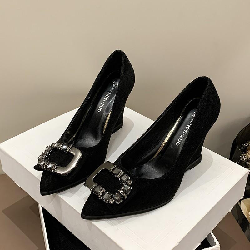 Мода 35-43 Модные туфли-клинья Женские Черные Сексуальные Туфли на высоком каблуке Острый носок Квадратная пряжка Стразы Карьерная рабочая обувь Tacones Mujer
