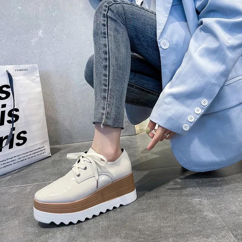 Мода Большой Размер Платформа Zapatos Para Mujeres 2025 Осень Шнуровка Обувь для Увеличения Роста Британский Стиль Черные Клинья Кожаная Обувь