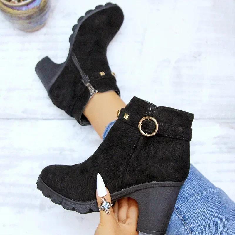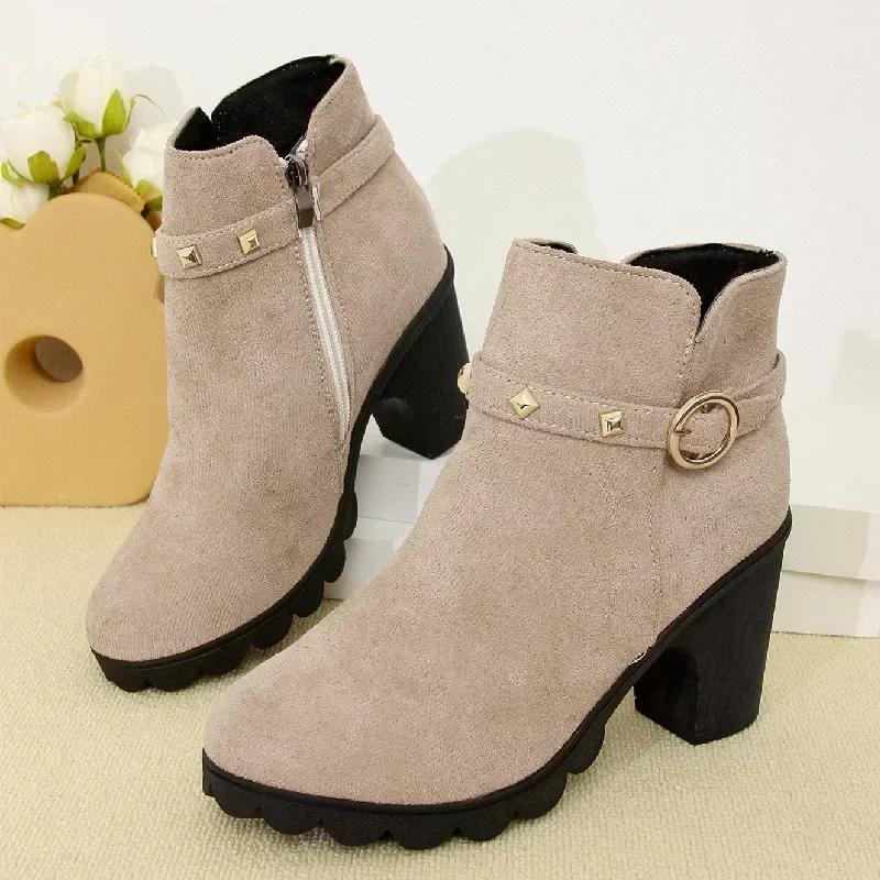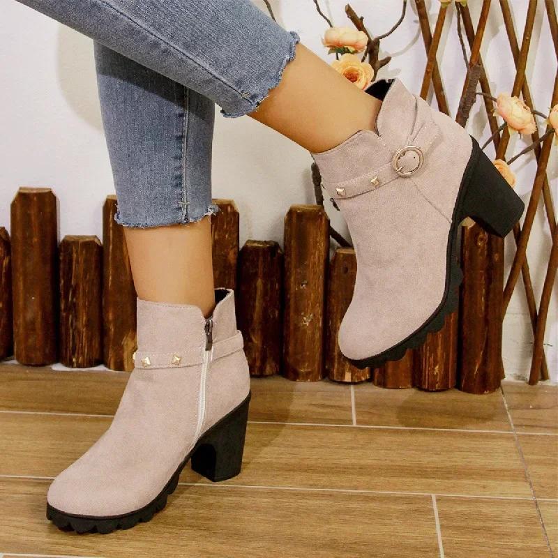 Мода 2024 года, ретро-ботфорты на высоком каблуке, женские высокие кожаные сапоги на квадратном каблуке, женские короткие ботильоны на круглом носке с заклепками на платформе, женские