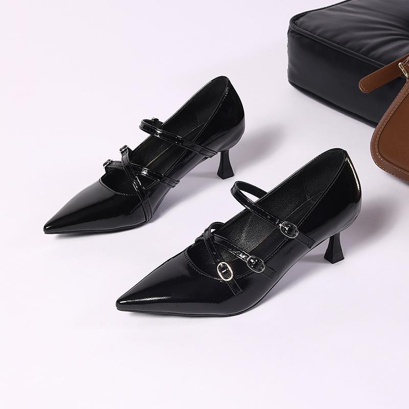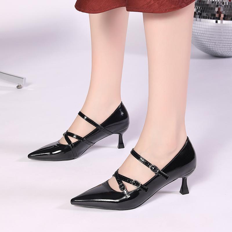 Мода Женская Мода Тонкий Каблук Одинарные Туфли Весна Новинка Острый Носок Мелкий Вырез Металлическая Пряжка Пряжка-Слово Тонкий Ремешок Низкий Каблук Туфли