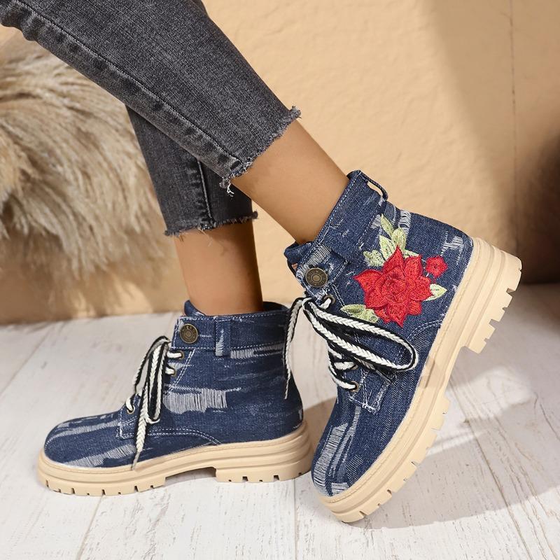 Модные женские массивные ботинки-одиночки Новые осенние с круглым носком Джинсовые вышитые На шнуровке спереди Толстая подошва Нескользящие ботильоны