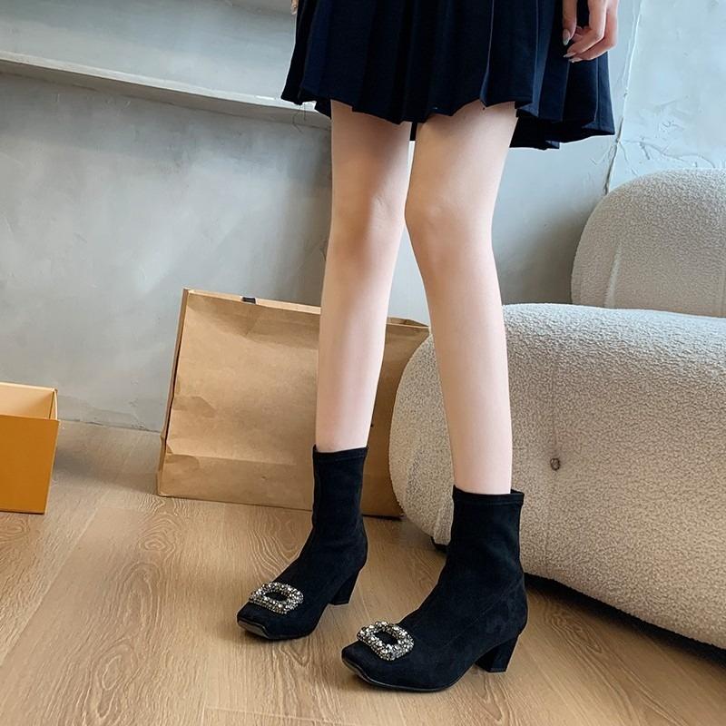Fashion Soft Leather Square Toe French Retro Booties Rhinestone Square Buckle Non-Slip Mid-Heel Stretch Skinny Boots
