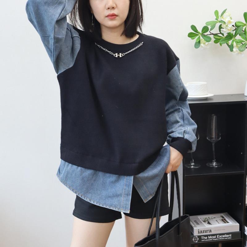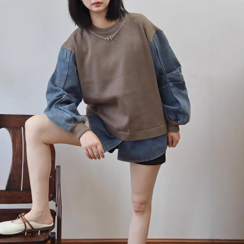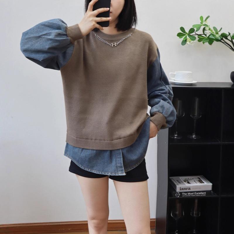 Вязаный свитер из денима с нашивками, топ, осень-зима, новый дизайн, свободный, имитация двухслойного свитера, пуловер, женский