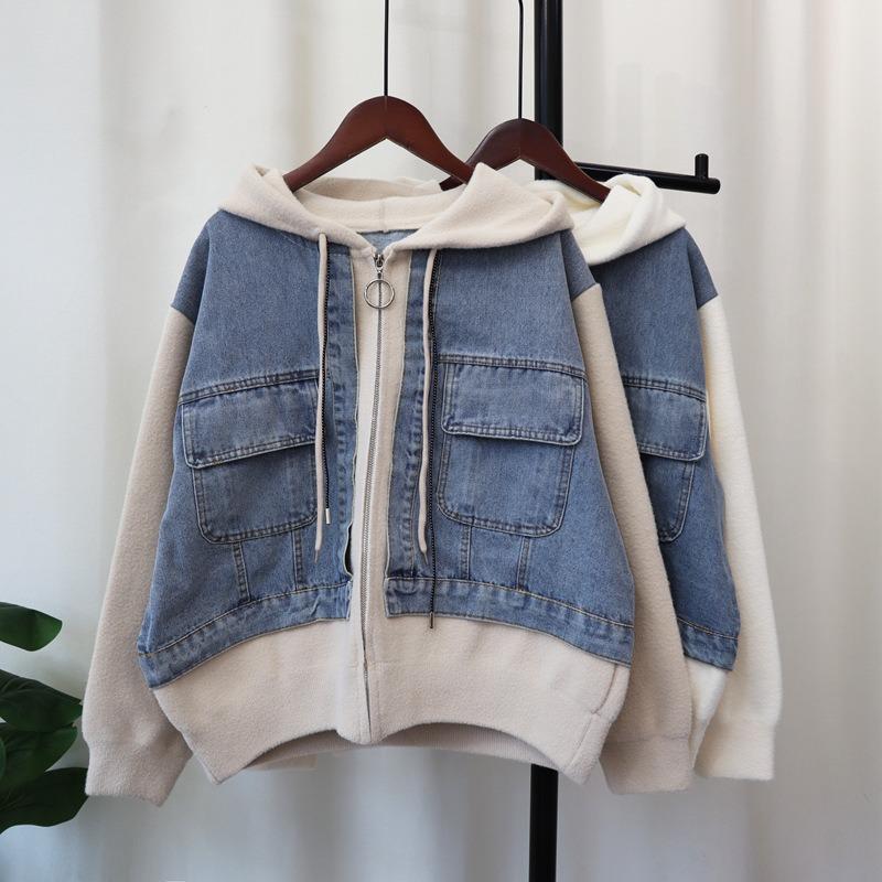 Джинсовый вязаный двусторонний кардиган с капюшоном на молнии, новый свободный повседневный свитер-куртка женский, осень-зима