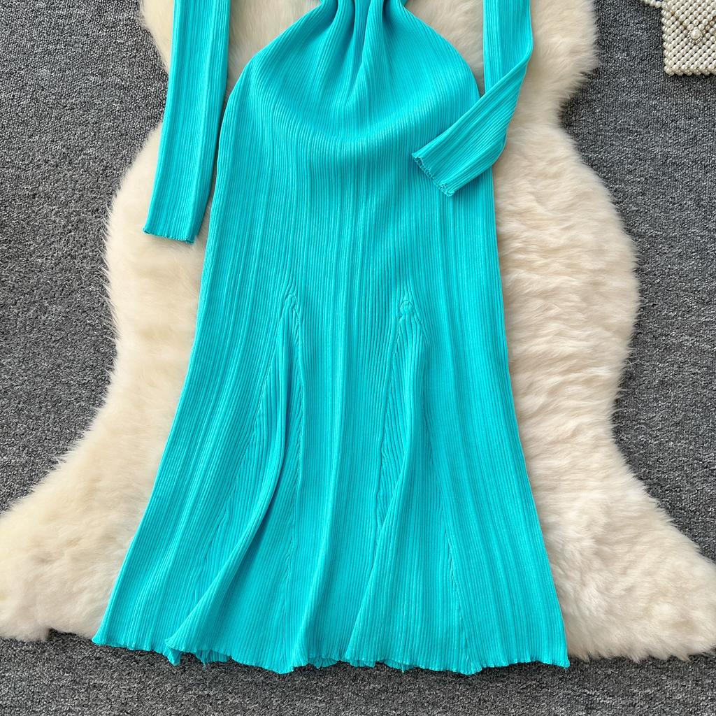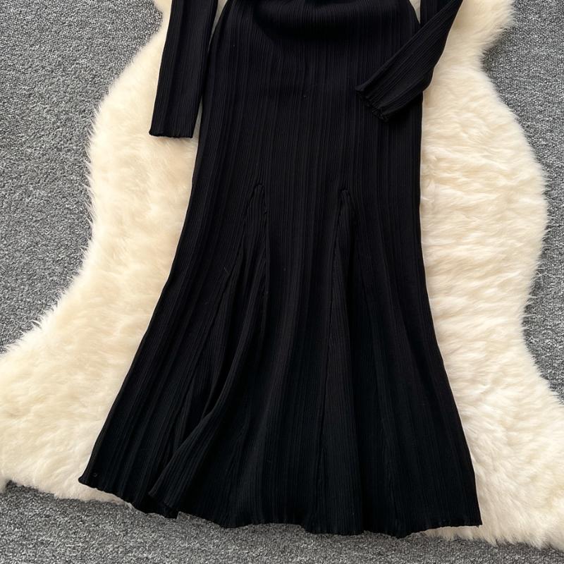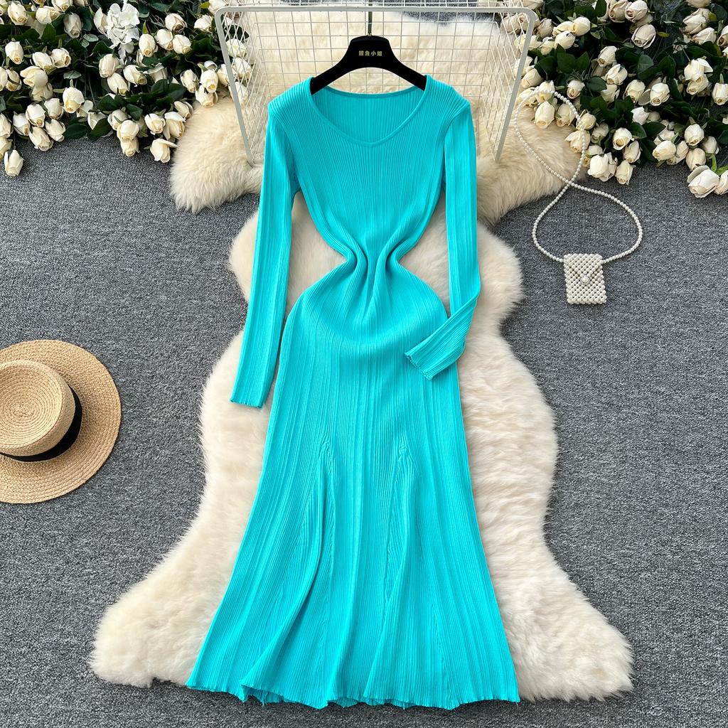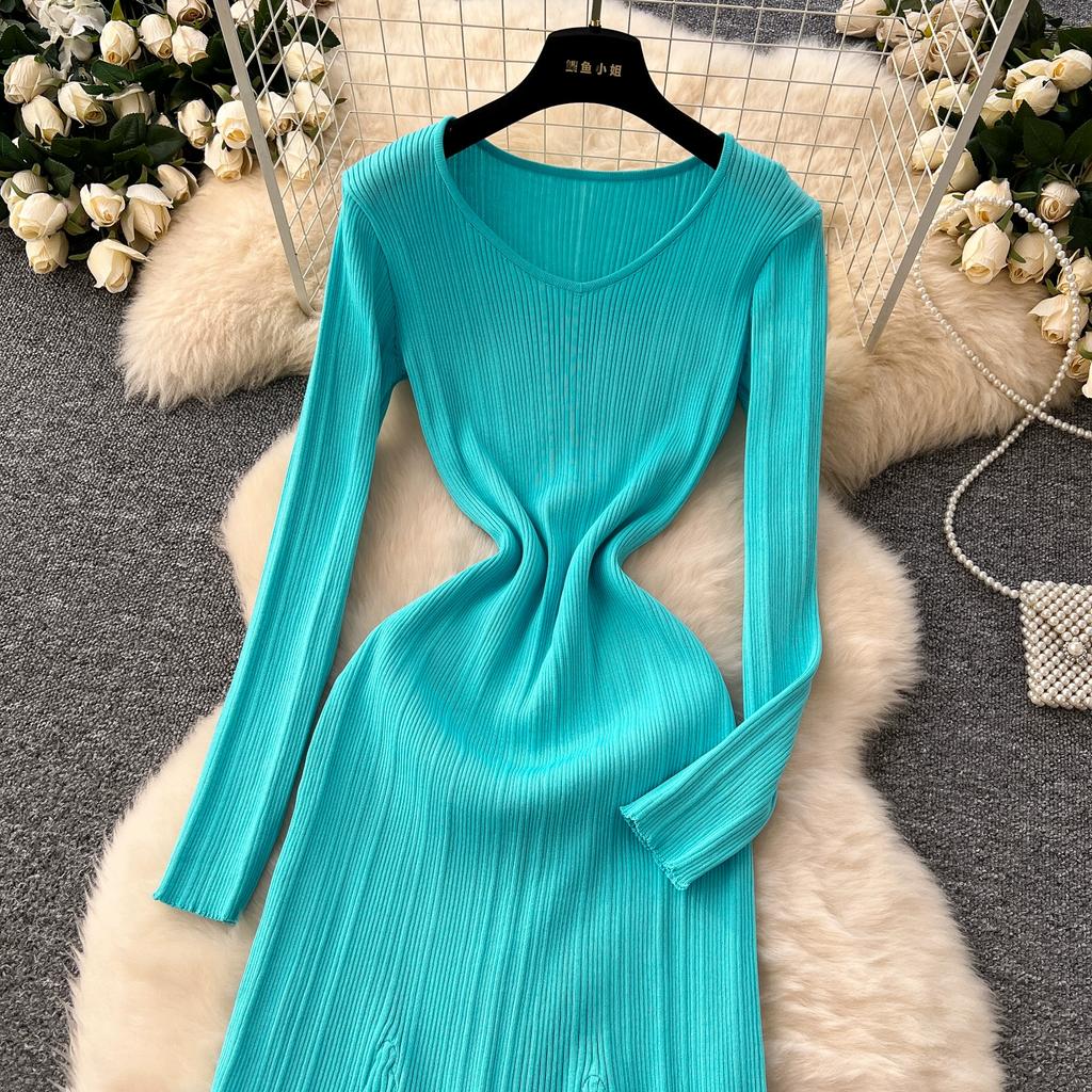 Осень Зима Женский Элегантный Вязаный Пуловер С V-образным Вырезом и Длинным Рукавом Длинные Макси Вечерние Платья Русалка