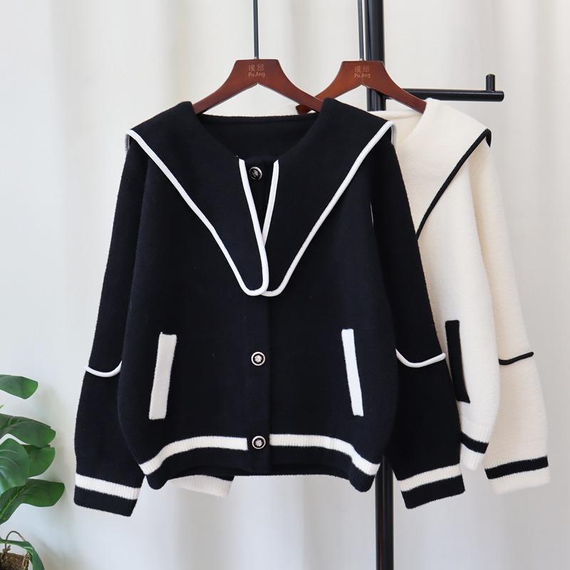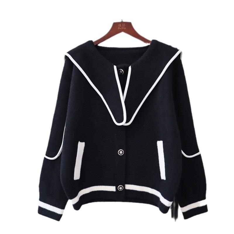 Осень и зима новый контрастный цвет темно-синий воротник вязаный двухсторонний кардиган темперамент свободный свитер куртка женская