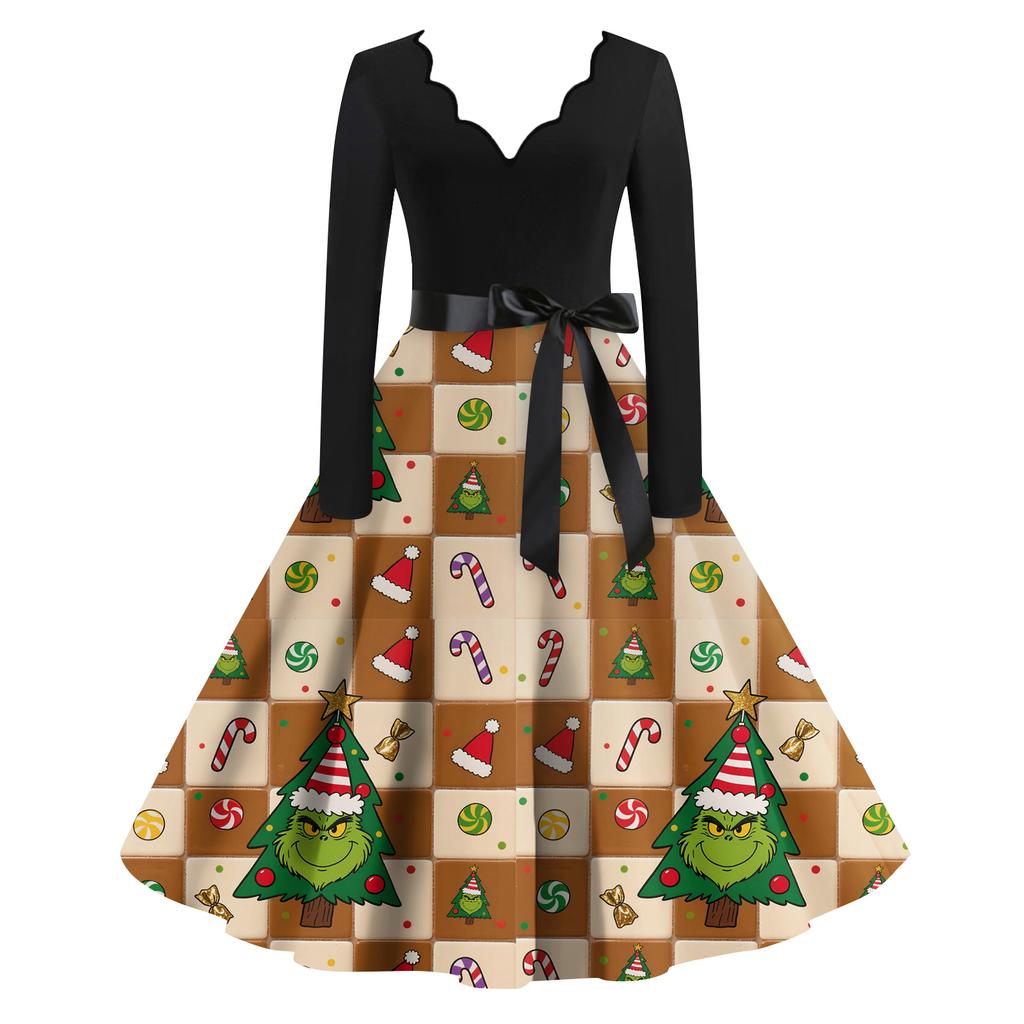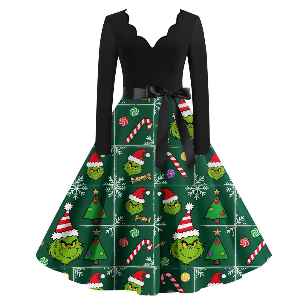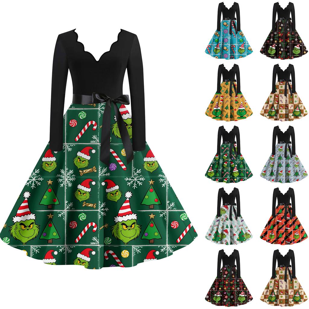 Женское модное ретро платье с длинным рукавом, квадратным вырезом, рождественским принтом, вечернее платье