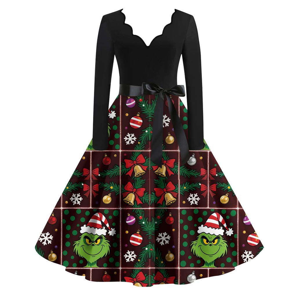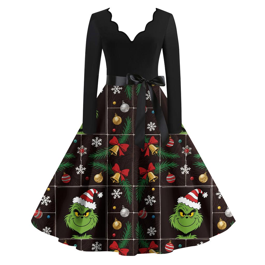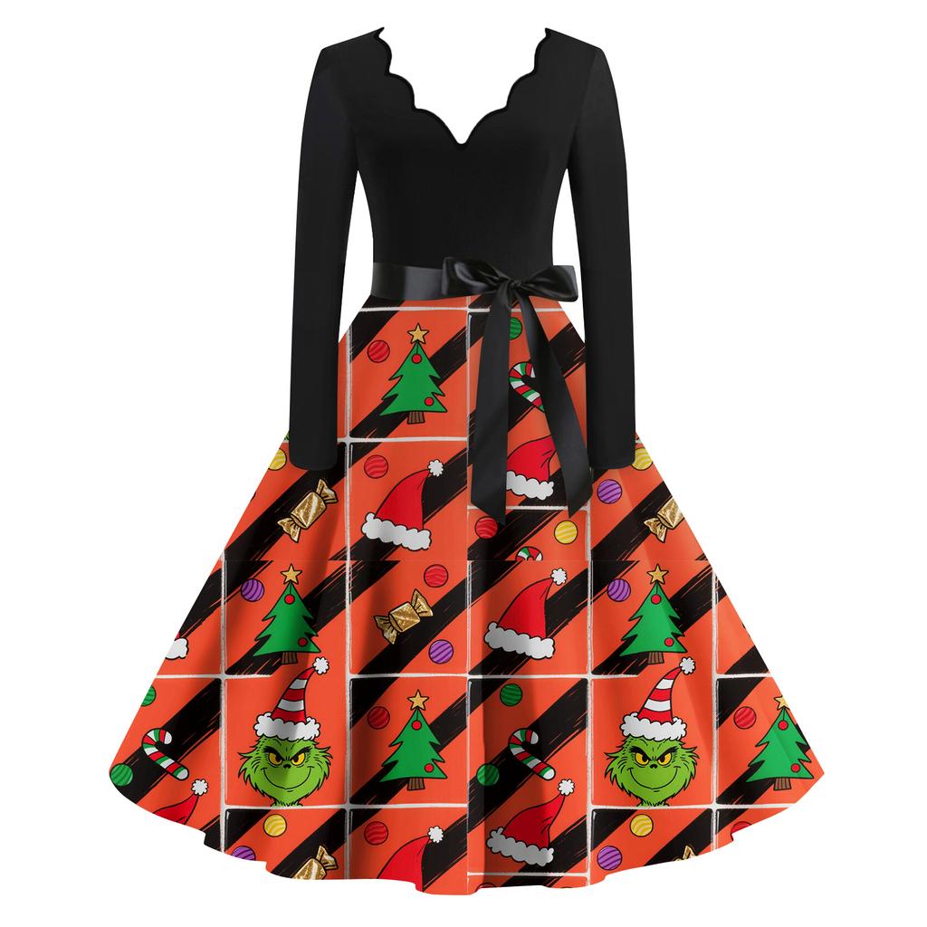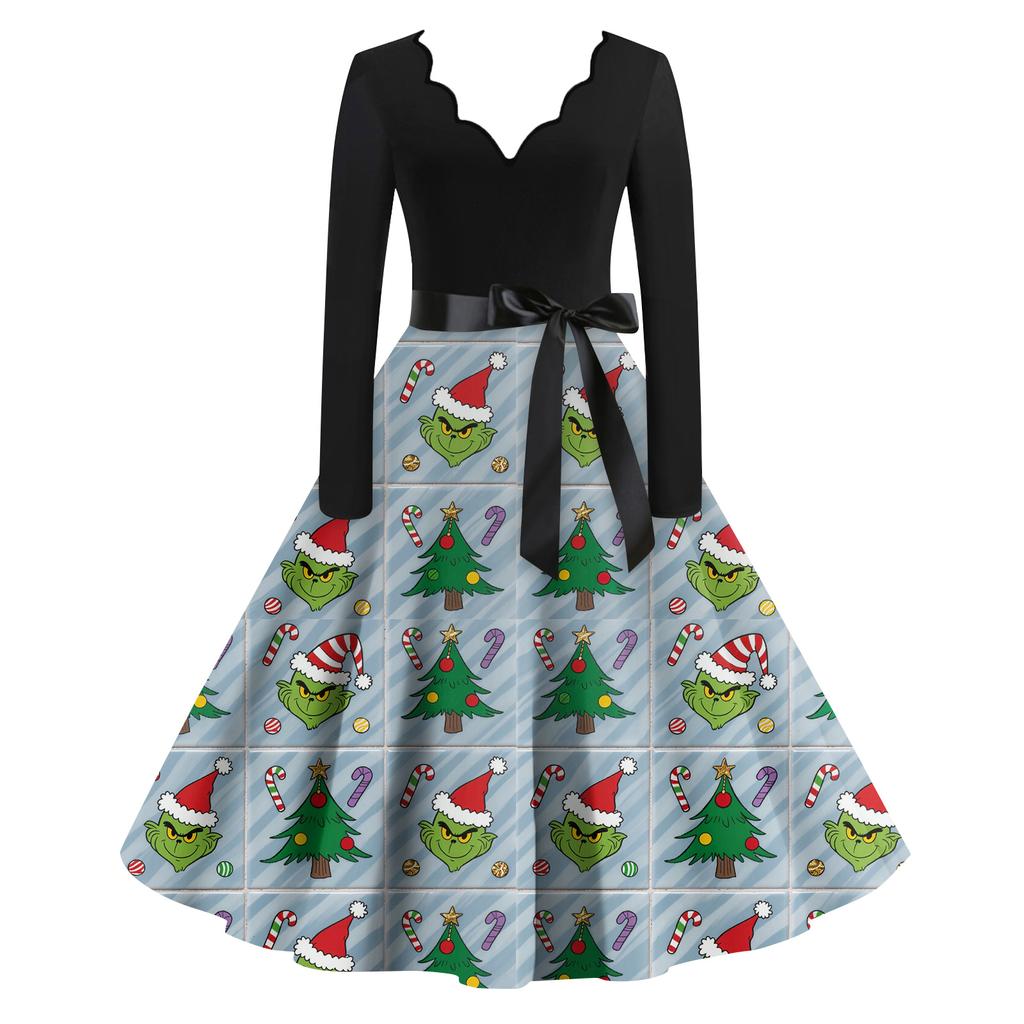 Женское модное ретро платье с длинным рукавом, квадратным вырезом, рождественским принтом, вечернее платье