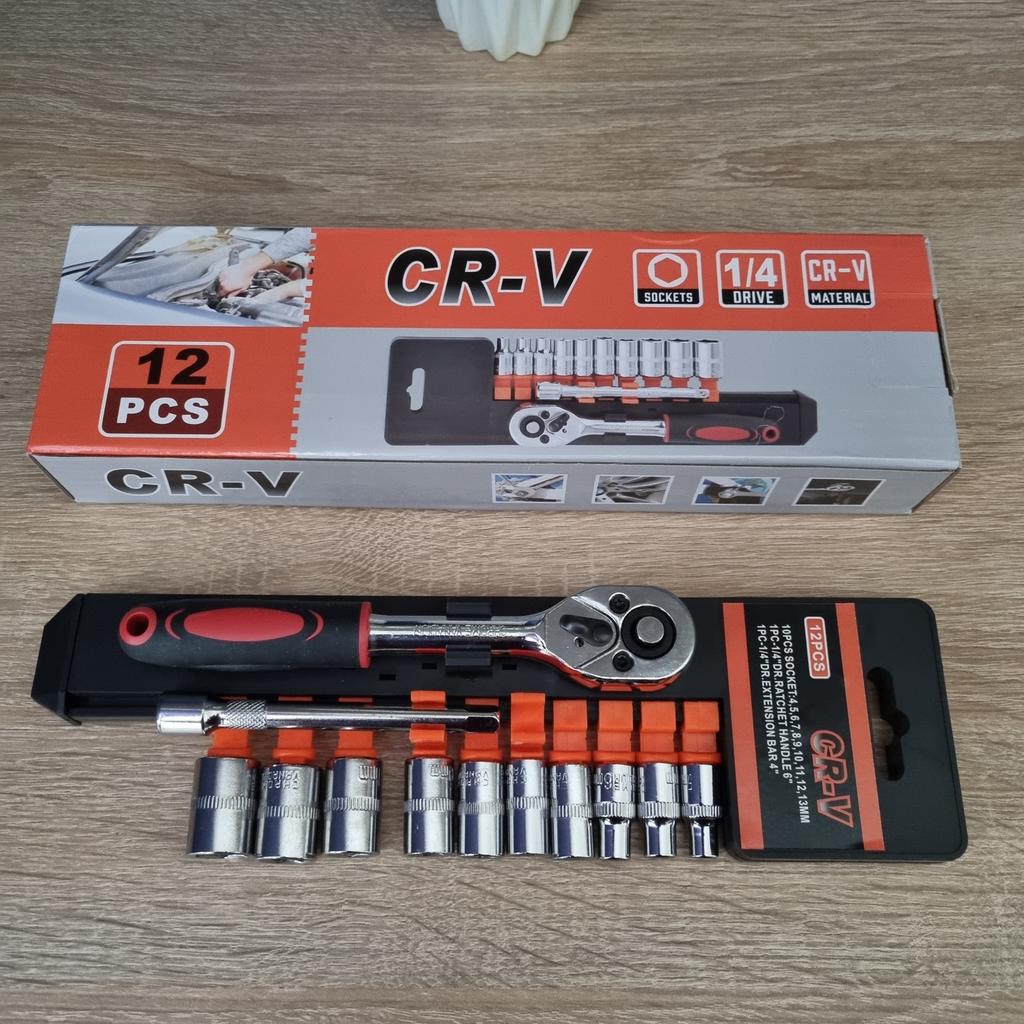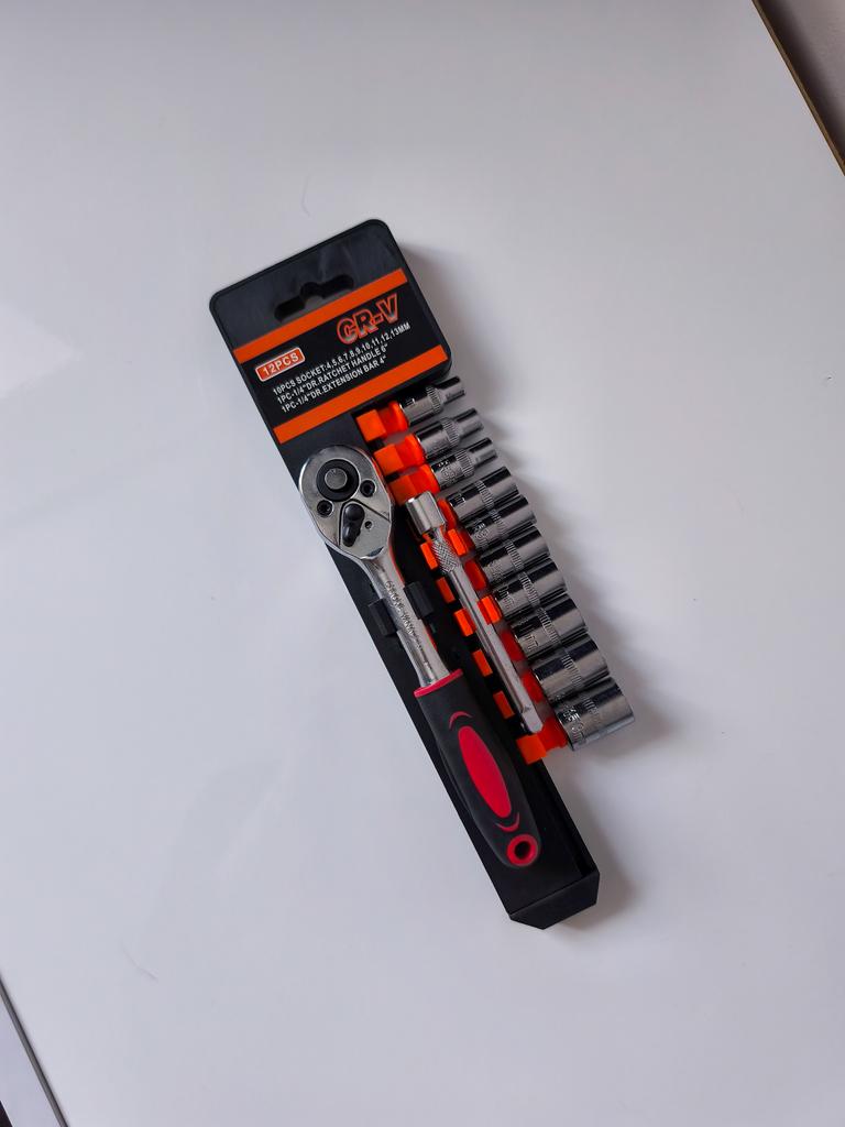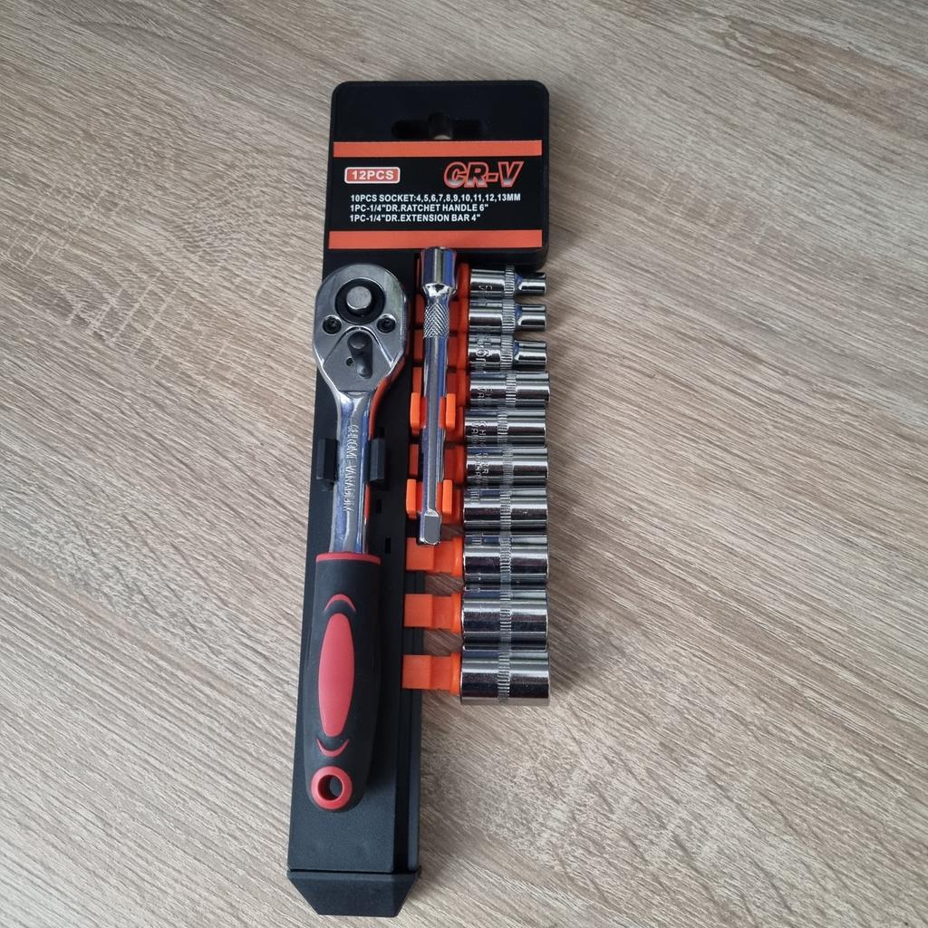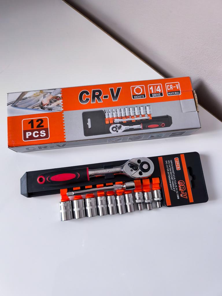 Набор инструментов CR-V 12 PCS: 🛠 Состав набора * 10 торцевых головок: размеры от 4 до 13 мм. * Трещотка: имеет прорезиненную черно-красную ручку для удобного хвата. * Удлинитель: 4-дюймовый бар для работы в труднодоступных местах. ✅ Основные плюсы * Материал: изготовлено из хромованадиевой стали (CR-V), что гарантирует прочность. * Компактность: все элементы закреплены на небольшом пластиковом держателе — удобно хранить в бардачке или ящике. * Универсальность: стандартный привод 1/4" подходит для большинства мелких бытовых и автомобильных задач. Итог: Базовый, надежный комплект для тех, кому нужен минимум инструментов под рукой для быстрого ремонта.