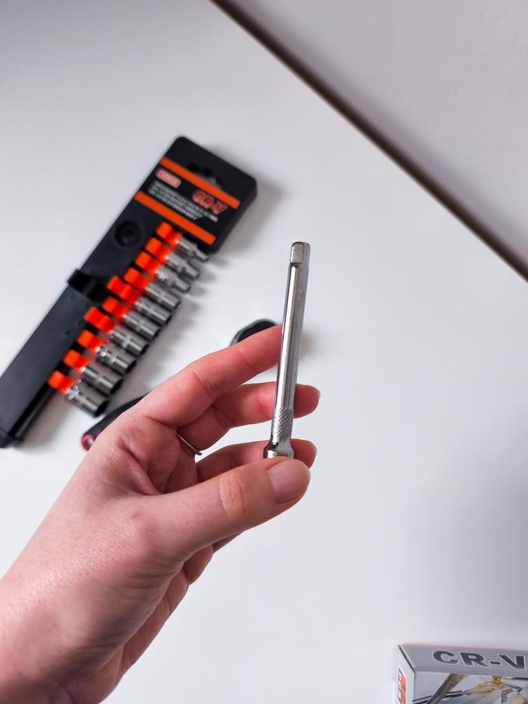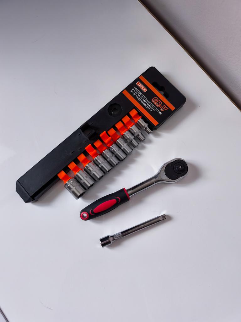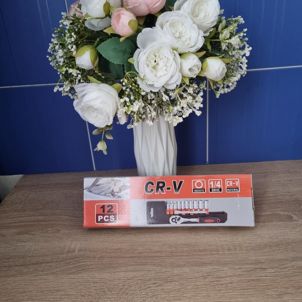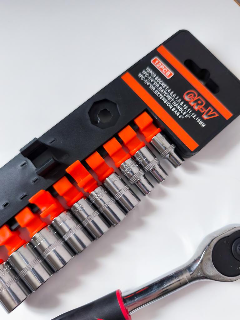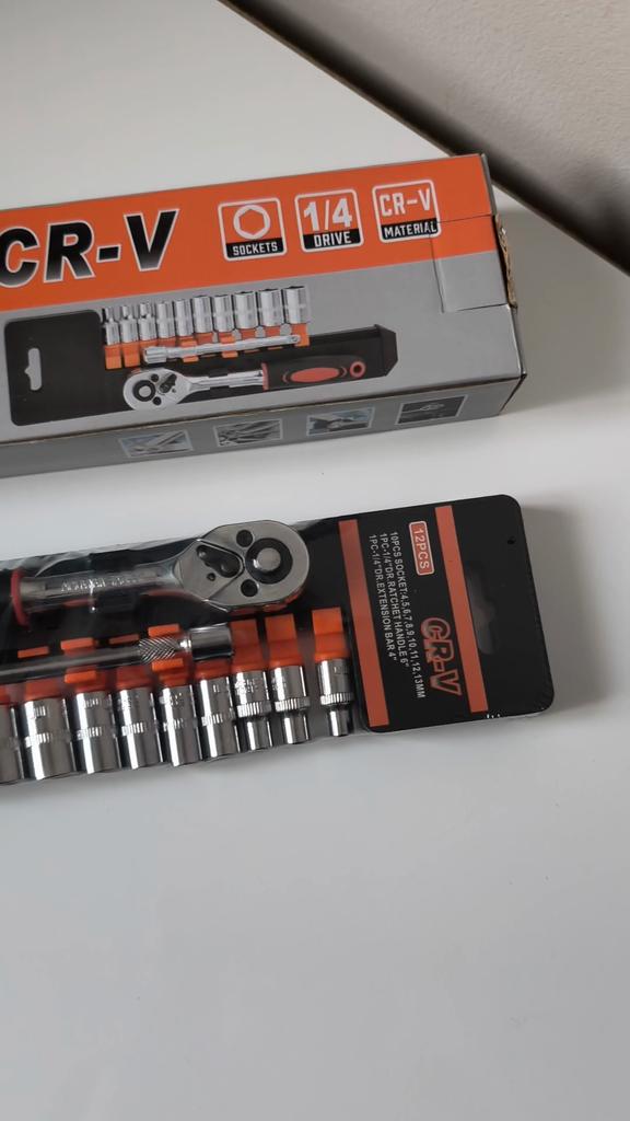 Набор инструментов CR-V 12 PCS: 🛠 Состав набора * 10 торцевых головок: размеры от 4 до 13 мм. * Трещотка: имеет прорезиненную черно-красную ручку для удобного хвата. * Удлинитель: 4-дюймовый бар для работы в труднодоступных местах. ✅ Основные плюсы * Материал: изготовлено из хромованадиевой стали (CR-V), что гарантирует прочность. * Компактность: все элементы закреплены на небольшом пластиковом держателе — удобно хранить в бардачке или ящике. * Универсальность: стандартный привод 1/4" подходит для большинства мелких бытовых и автомобильных задач. Итог: Базовый, надежный комплект для тех, кому нужен минимум инструментов под рукой для быстрого ремонта.
