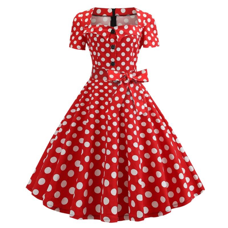 Женское платье в стиле ретро с квадратным вырезом Хепберн, короткими рукавами, поясом на талии и юбкой-маятником в горошек