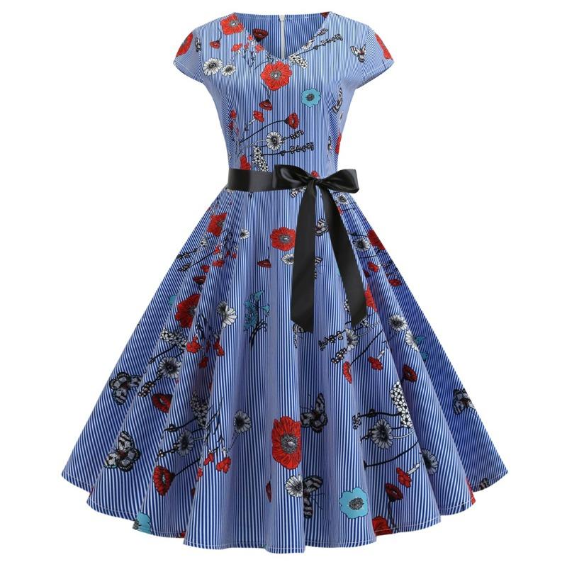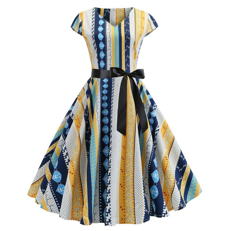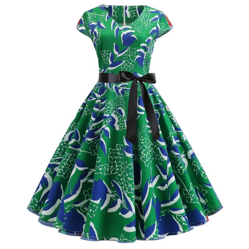 Винтажное платье с V-образным вырезом, рукавами-крылышками, принтом по всему телу, пышной юбкой и черной лентой