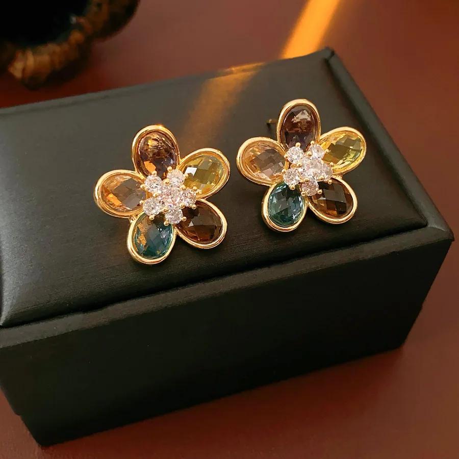 Цветные серьги-гвоздики в виде цветка из циркониевого стекла для женщин, легкая роскошь, дворцовый стиль, универсальные, высококлассная модная циркониевая бижутерия в подарок