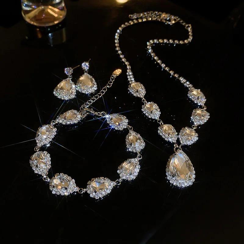Преувеличенный набор из 2 предметов с инкрустированными стразами: браслет в виде капли воды, геометрическое ожерелье, роскошные серьги, темпераментные цирконовые наборы для женщин