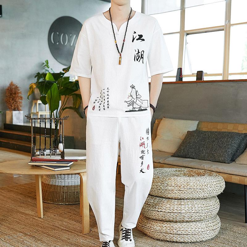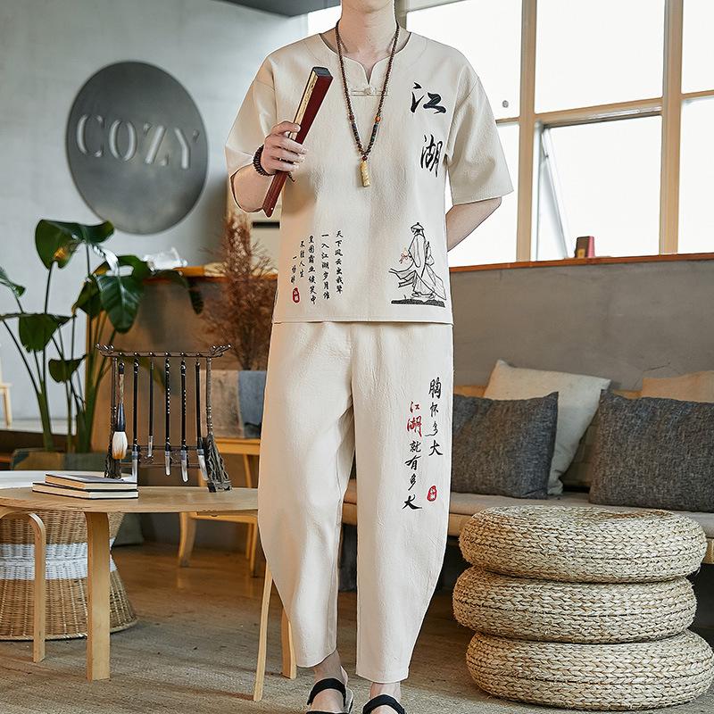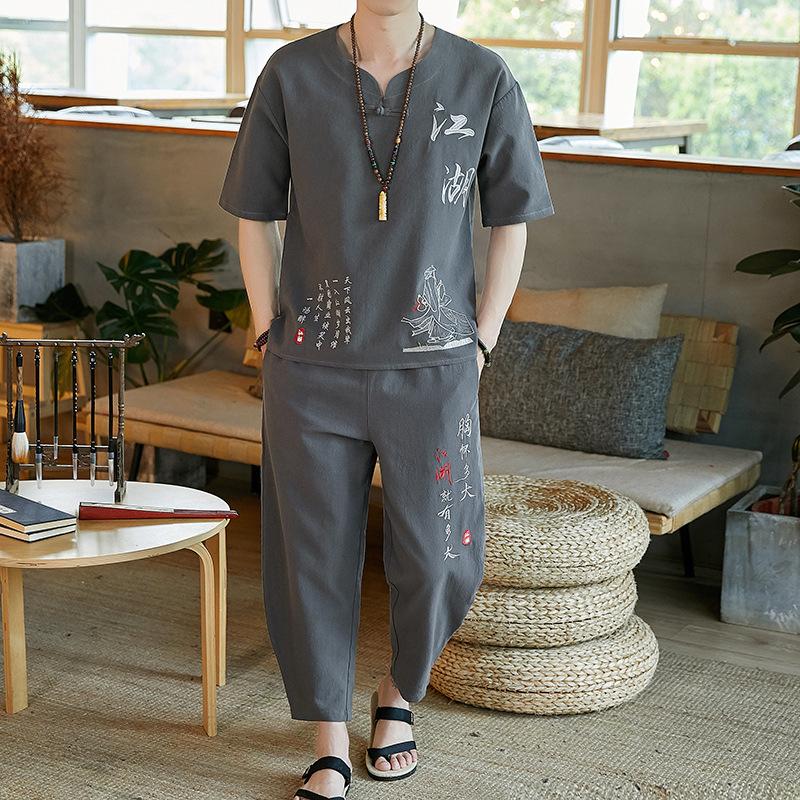 Льняной костюм в китайском стиле, мужская футболка в стиле ретро с короткими рукавами, хлопковый и льняной костюм в стиле Тан, летний костюм больших размеров