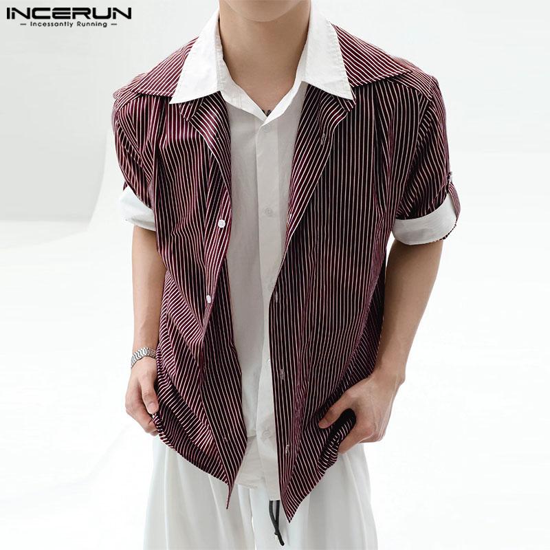 INCERUN Мужские футболки с отложным воротником, коротким рукавом, в полоску пэчворк, повседневной текстуры