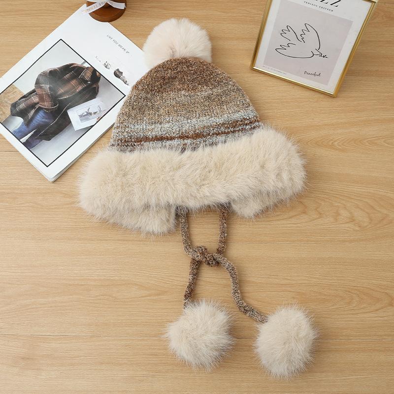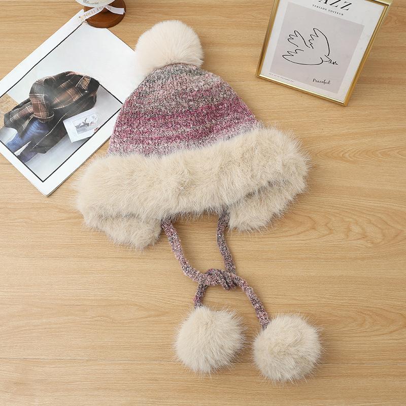 Милая плюшевая теплая шапка с меховым помпоном на осень и зиму, универсальная, в национальном стиле, утолщенная шапка-пуловер с добавлением бархата, уличная, ветрозащитная, с защитой ушей