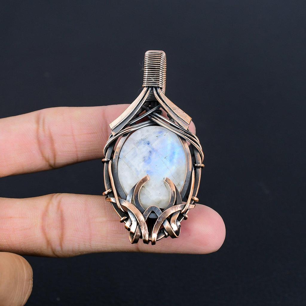 Подвеска из радужного лунного камня, ювелирное изделие из драгоценного камня, подвеска, обернутая медной проволокой 999 пробы, красивая подвеска ручной работы