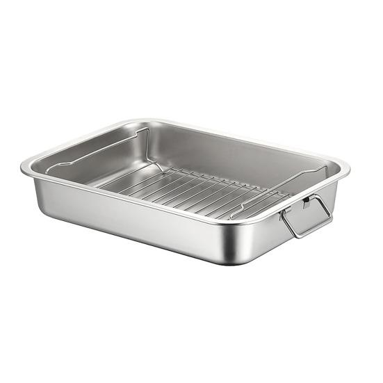 Представляем противень из нержавеющей стали. Этот противень предотвращает разбрызгивание масла в духовке и собирает вытопившийся жир для подливы.. Прочная стальная ручка обеспечивает легкий подъем и снятие.
