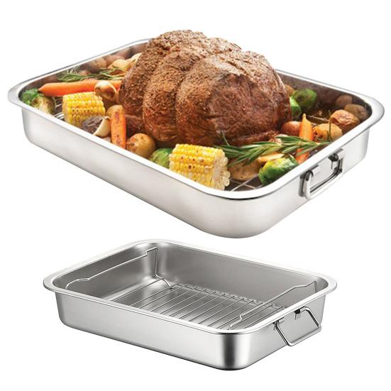 Многоцелевое использование: Эта большая сковорода-гриль идеально подходит для запекания индейки, ветчины, ребер, курицы и овощей.. Его просторный дизайн позволяет разместить праздничные застолья или приготовить еду для больших семей, что делает его универсальным дополнением к любой кухне.