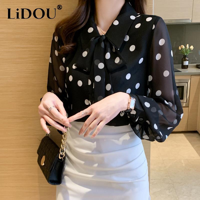 Весна Осень Элегантная Мода Принт в Горошек Рубашка Женская Длинный Рукав Темперамент Блузка с Бантом Женская Повседневная Блузка