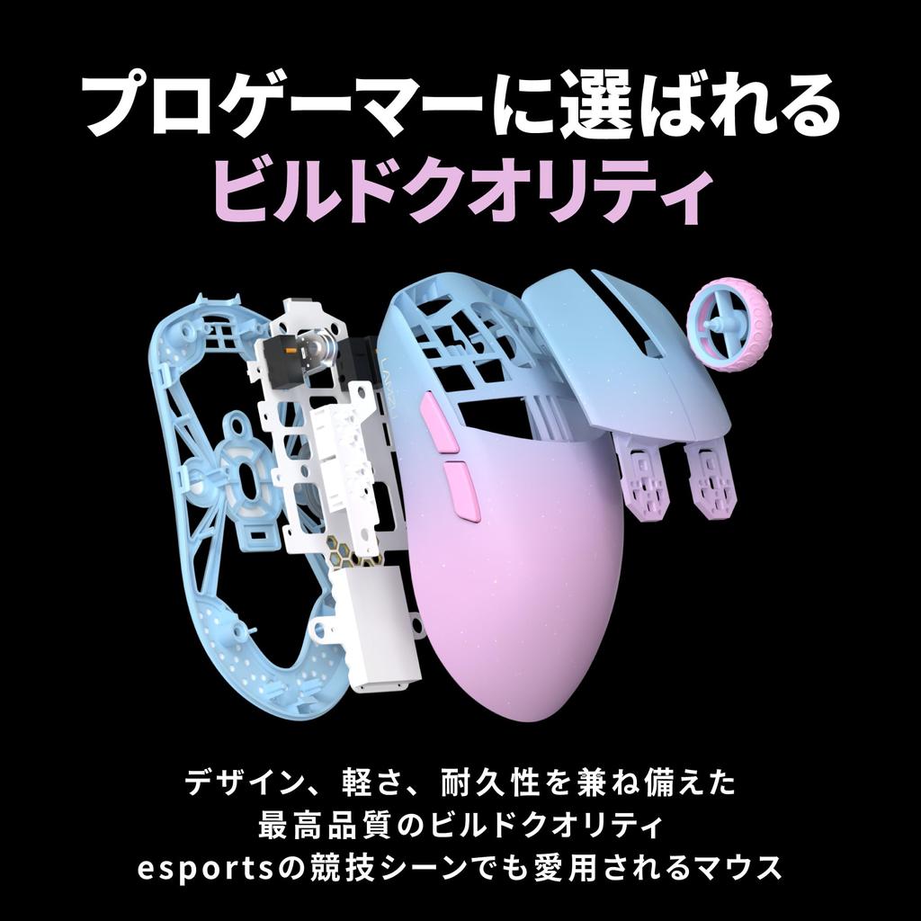 PARO, лимитированная расцветка из коллаборации LAMZU × REJECT, имеет розово-голубой градиент, вдохновленный японским ночным небом.. Эта простая и стильная игровая мышь вдохновлена Млечным Путем и Вегой. (звезда Вега). В REJECT мы «Расширяем возможности игровой жизни» и расширяем возможности всех киберспортсменов. Размер товара: приблизительно. 119 x 62 x 38 мм Вес продукта: 45 г Подключение: Беспроводная / Проводная Частота опроса: До 8000 Гц (беспроводное соединение) Датчик: Pixart 3950 (до 30 000 DPI / 50 г / 750 IPS) MCU: Nordic 52840 Микропереключатель: Оптический переключатель Тип батареи: перезаряжаемый: До 80 часов (с частотой опроса 1000 Гц) аксессуары: 8K ресивер, кабель USB-A на USB-C, запасные ножки для мыши, лента для захвата, наклейка ограниченного выпуска, мешочек на шнурке, руководство по быстрой настройке