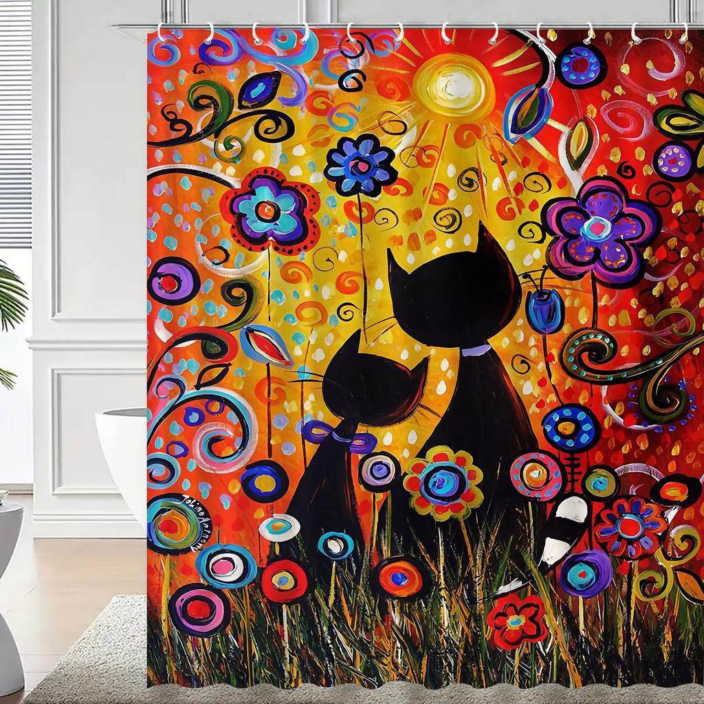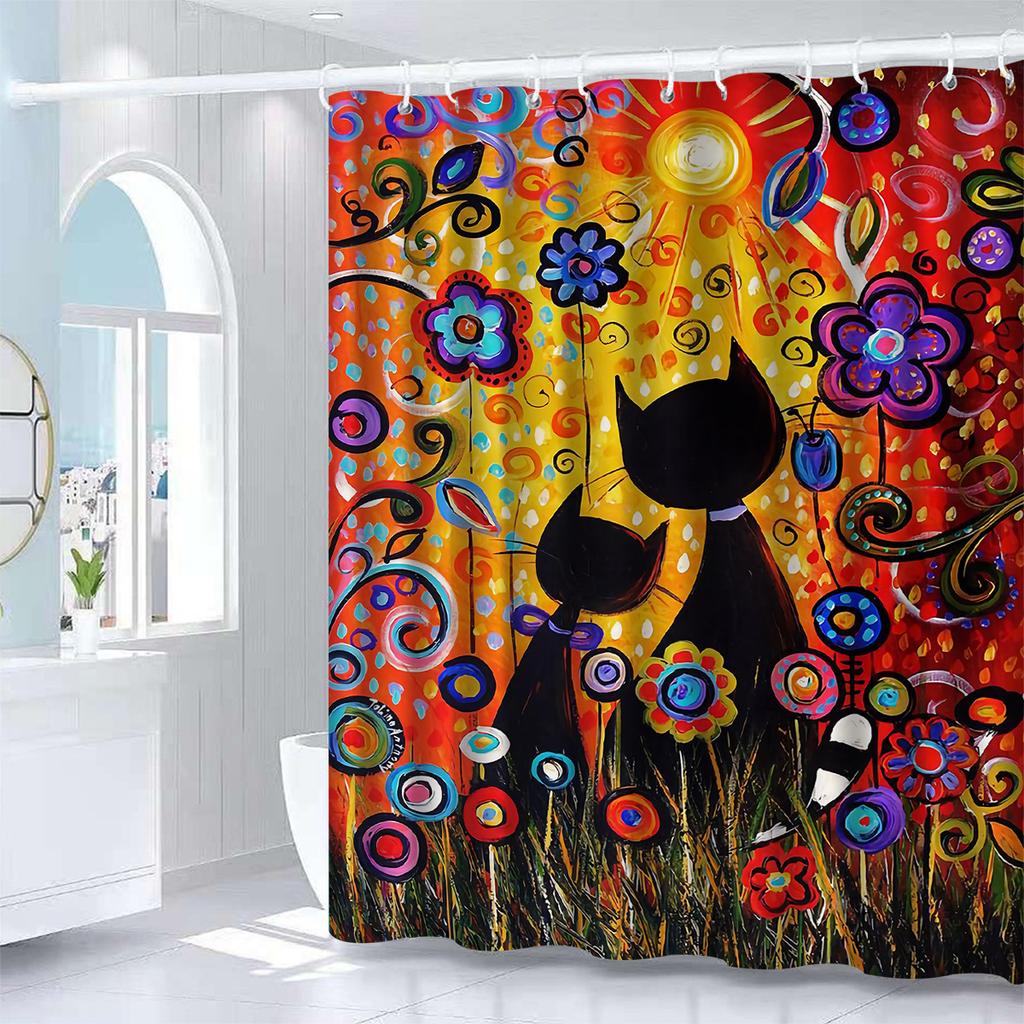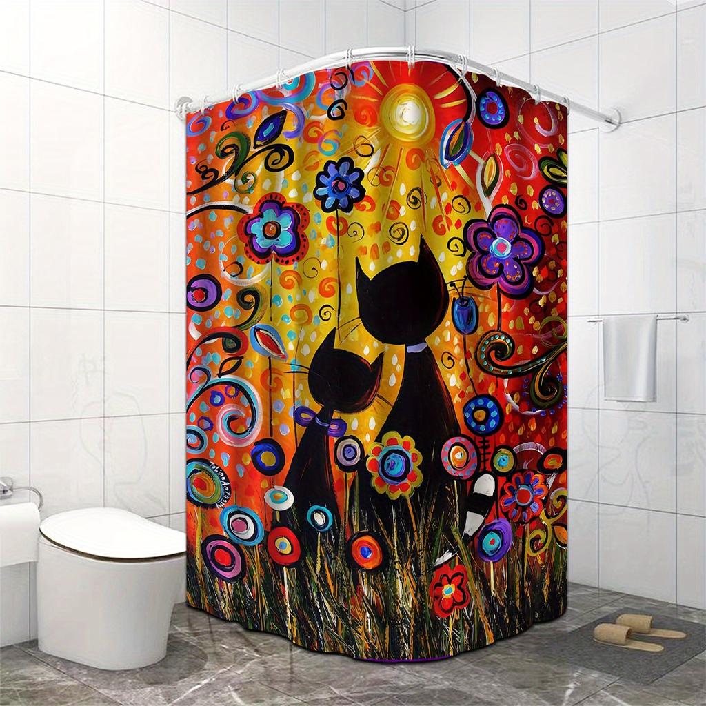Яркая водонепроницаемая шторка для душа с защитой от плесени «Кошка и цветы» - Красочный художественный дизайн для игривого декора ванной комнаты