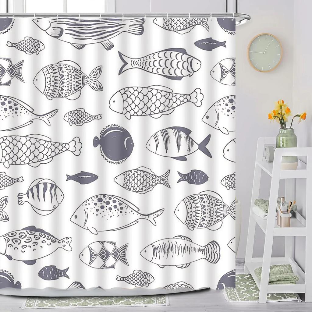 Смешная шторка для душа с рыбками, мультяшный океан, ручная роспись, синяя, детская, милый животный принт с китом, тканевая, украшение для ванной комнаты с крючками