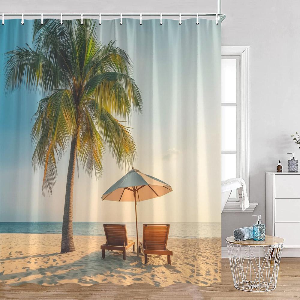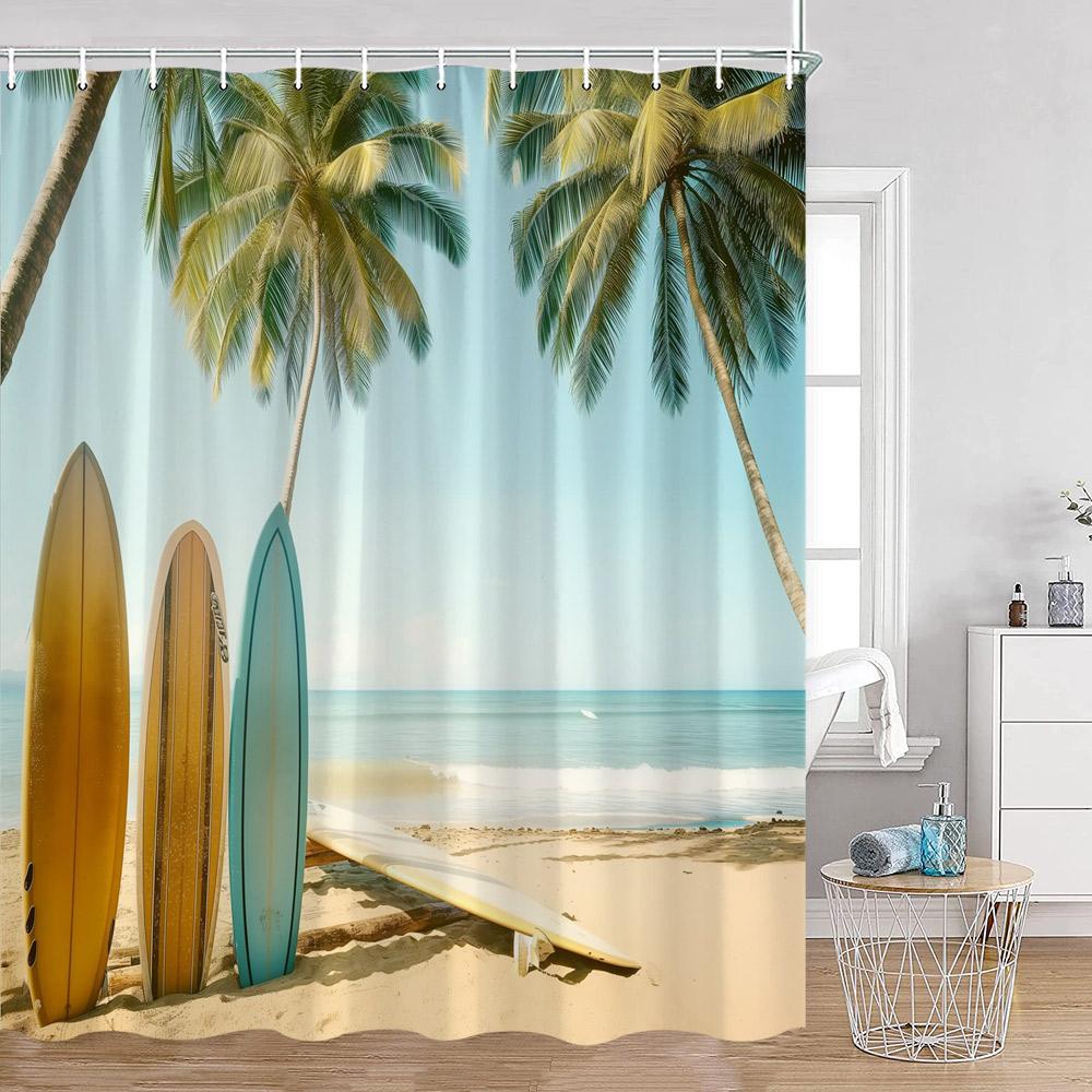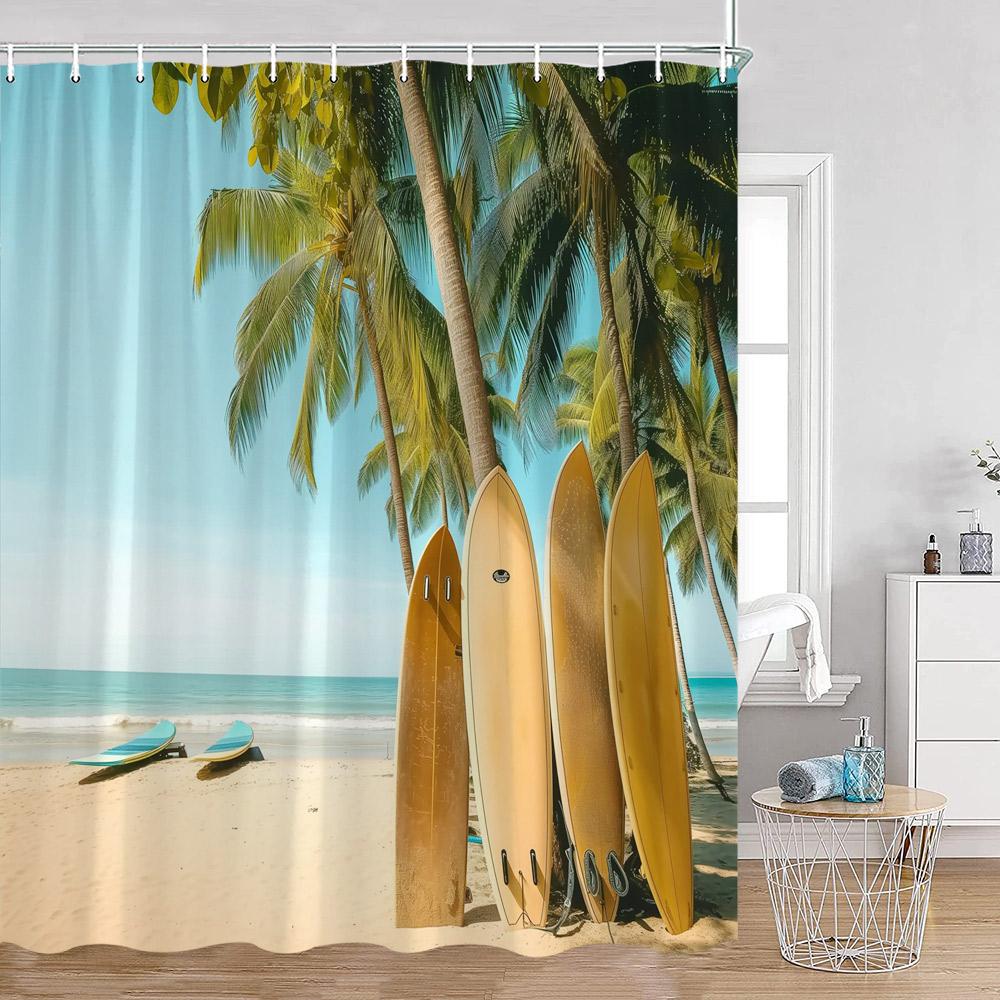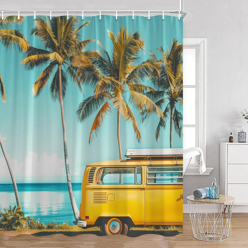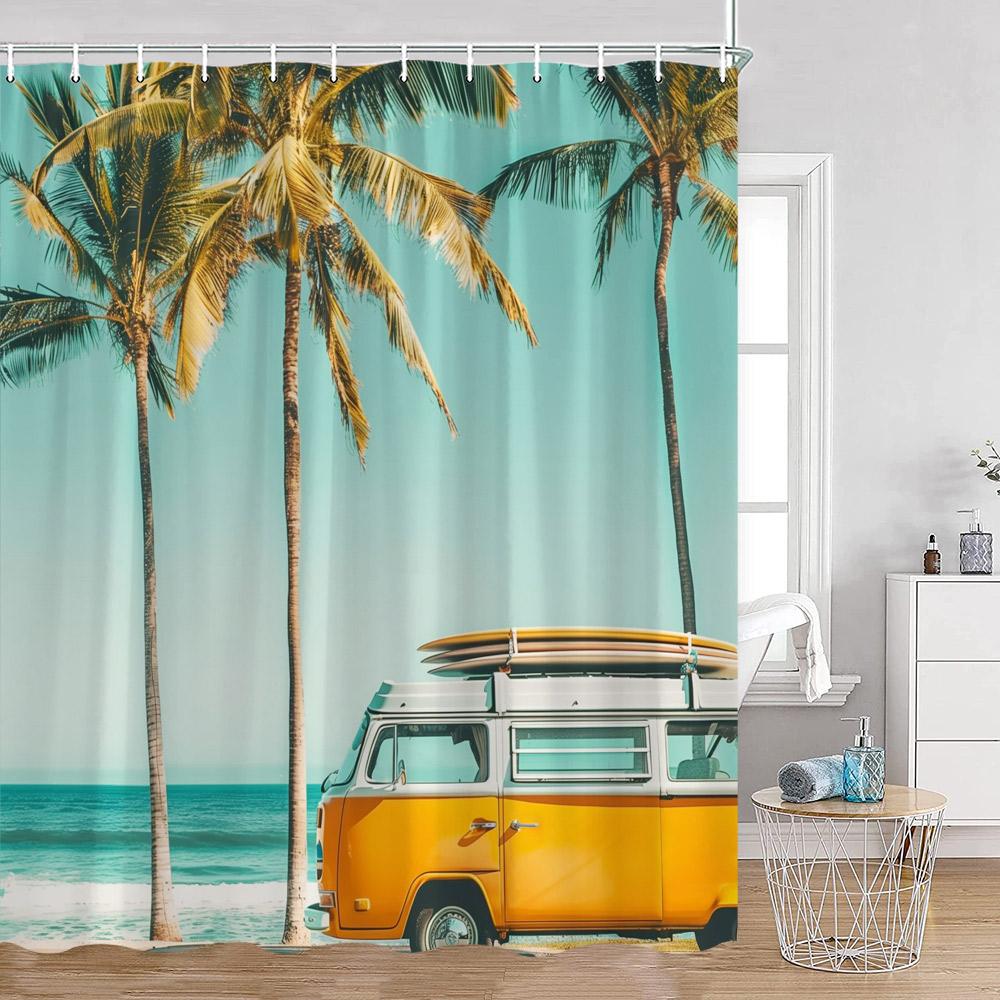 Кемпинг Серфинг Занавески для душа Летний отпуск Путешественник Автодом Пляж Кокосовые пальмы Морской берег Украшения для ванной комнаты Ретро Занавески для ванны