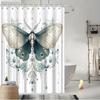 Занавеска для душа в стиле модерн с мотыльком - Светло-зеленый, Золотистые узоры и глазки, Полиэстер, Машинная стирка, 12 крючков, Декор для ванной