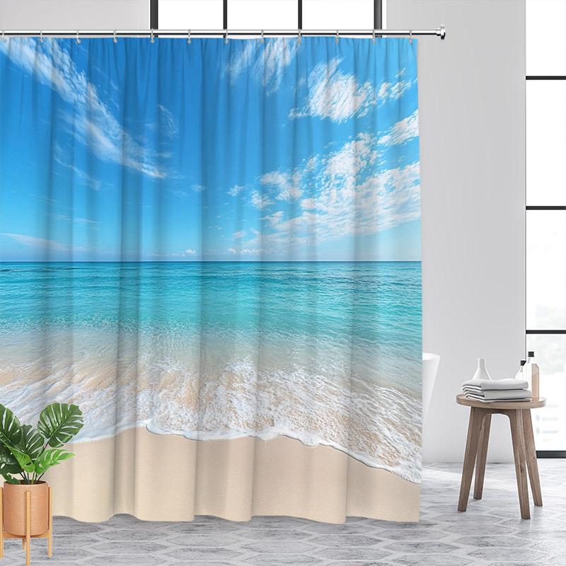 Водонепроницаемая шторка для душа с безмятежным пляжным пейзажем, привносящая спокойствие океанских волн и голубого неба в вашу ванную комнату.