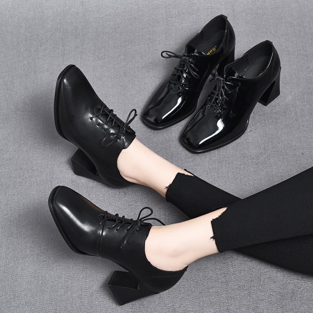 Женская обувь 2025 весна новая темпераментная обувь-лодочки на высоком каблуке черная из первого слоя коровьей кожи на толстом каблуке шнуровка с глубоким вырезом квадратный носок